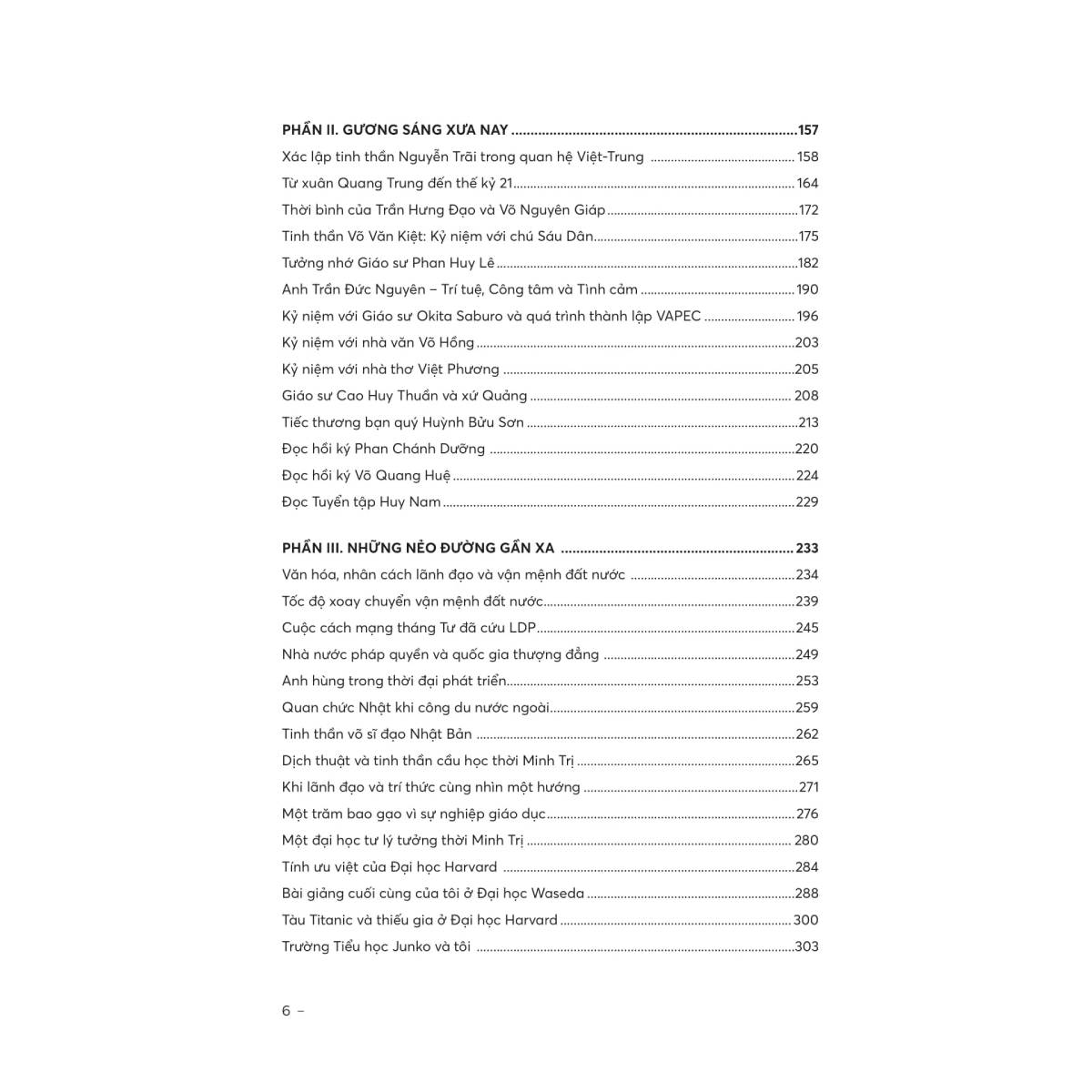 • Phần III và IV: Tập trung vào các vấn đề thời sự như kinh tế thị trường, giáo dục đại học, chính sách công, lãnh đạo quốc gia, văn hóa chính trị, kinh nghiệm quốc tế và khát vọng phát triển đất nước.