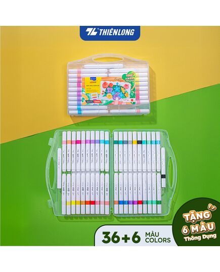 Hộp 36+6 Bút Lông Màu Đầu Brush Thiên Long Acrylic Markers ACM-C022Bút lông màu Acrylic Markers Thiên Long Colokit 12/24/36 màu với thiết kế đầu BRUSH linh hoạt đáp ứng được đa dạng nhu cầu sử dụng. Bút màu Acrylic khô nhanh, chống nước tốt và sử dụng được trên nhiều chất liệu như giấy, vải, nhựa, gốm…TÍNH NĂNG SẢN PHẨM▪️ Đầu BRUSH linh hoạt.▪️ Ngòi bút chống mài mòn, mực ra đều.▪️ Khô nhanh, chống nước tốt.▪️ Vẽ được trên các chất liệu: canvas, vải, giấy, gỗ, nhựa, thủy tinh, gốm sứ, kim loại…▪️ Có khả năng chồng màu tốt.▪️ Nắp bút có thiết kế chống ngạt bảo đảm an toàn cho người dùng.▪️ Hộp đựng bút bằng nhựa cứng cáp.▪️ Phù hợp với người mới bắt đầu đến vẽ chuyên nghiệp.TIÊU CHUẨN VÀ BẢO QUẢN▪️ Tiêu chuẩn: Sản xuất theo TCCS 0175:2023/TL-BLMA▪️ Kích thước bút: 136mm; Φ12mm.▪️ Bảo quản: Không thích hợp cho trẻ dưới 3 tuổi. Tránh xa nguồn nhiệt, hóa chất. Đậy nắp sau khi sử dụng.