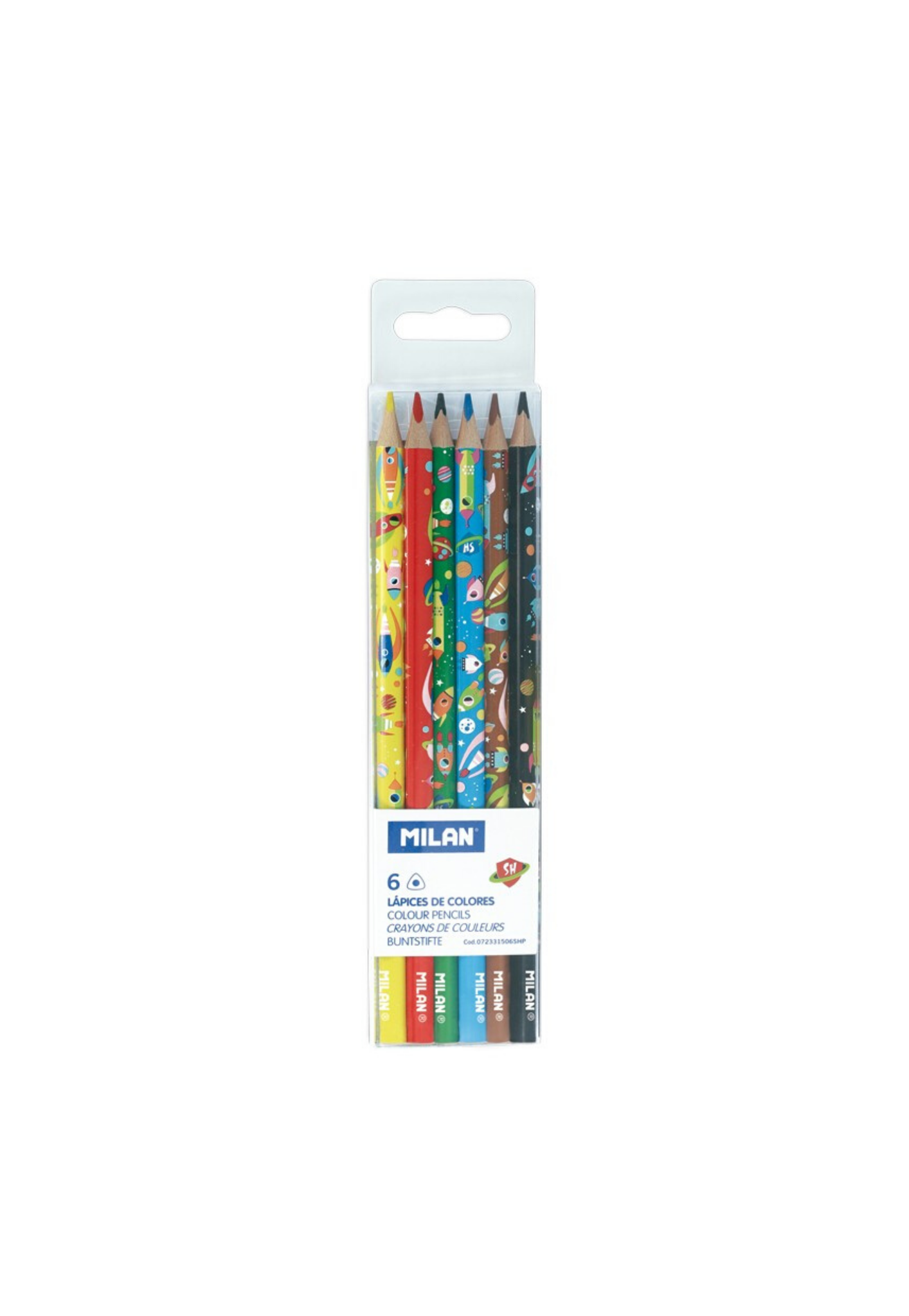 Hộp 6pcs viết chì màu 1 đầu Milan 072331506SHP Bút chì màu Super Heroes Space phiên bản đặc biệt. Thân bút hình tam giác với ngòi chì 2,9 mm. Bút chì tạo ra một nét đồng đều và có khả năng chống gãy do LPS (Hệ thống bảo vệ chì) giúp tăng cường chì bằng cách kết dính vào gỗ. Hộp 6 màu: vàng, xanh dương, nâu, đen, đỏ, xanh lá cây.