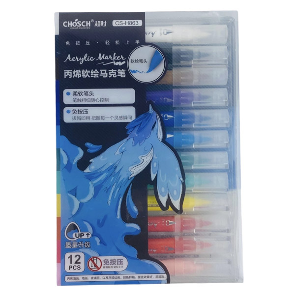 Bút lông màu Acrylic Chosch CS-H863 với các ưu điểm nổi bật bút có đầu brush có thể viết được nét thanh nét đậm và tô màu như các loại bút lông khác. Màu sắc tươi sáng, phân lớp trung thực, mực đầu sợi bút mật độ cao, không trổ lông, chống nước, chống nhiệt, bảo quản lâu dài. Ngoài ra, khác với các loại bút lông thông thường khác bút lông màu  Acrylic Chosch có khả năng chồng màu lên nhau và không bị lem ra mặt sau của giấy khi sử dụng.