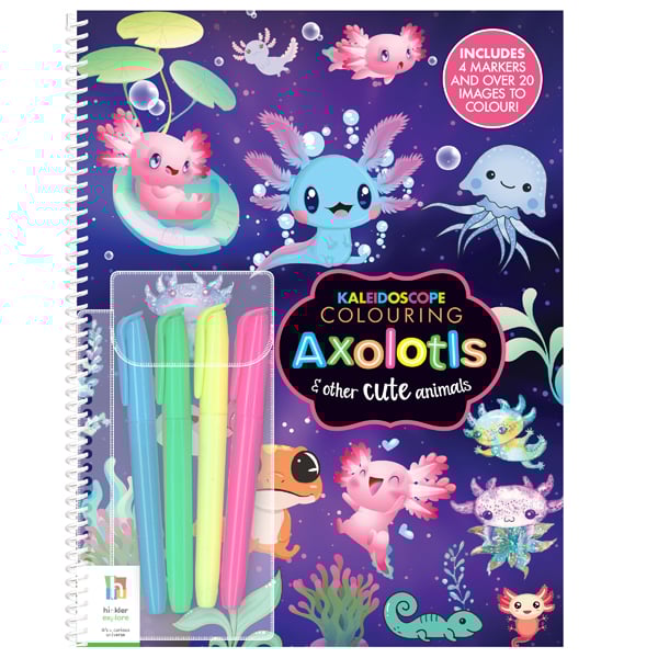 Join the axolotls on an adorable colouring journey! Featuring 32 colouring pages of on-trend axolotls as well as other cute critters including fish, geckos and chameleons, and four neon markers, this fun 'n handy kit will provide hours of arty fun!