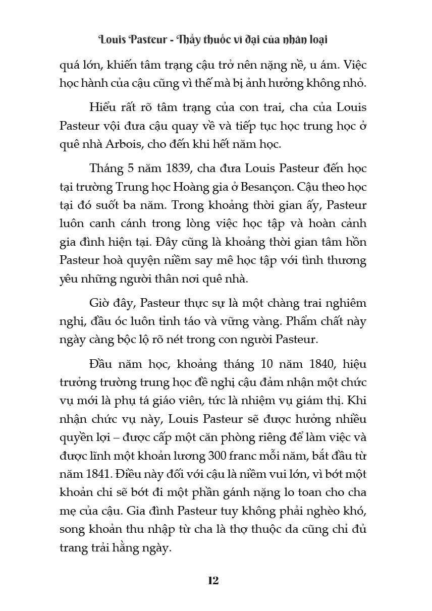 Có thể khẳng định rằng, hiếm có người cứu sống được nhiều sinh mạng hơn Louis Pasteur. Những vắc-xin ông phát triển cho đến nay vẫn tiếp tục cứu sống và bảo vệ hàng triệu người trên thế giới. Những nghiên cứu của ông về vi trùng đã cách mạnh hóa y tế. Louis Pasteur - Thầy thuốc vĩ đại của nhân loại là cuốn sách kể về câu chuyện cuộc đời của nhà khoa học Louis Pasteur. Cuốn sách mang đến cho bạn đọc thêm những góc nhìn rất mới về ông - một cậu bé sống tình cảm và ham học, một tuổi trẻ dám dấn thân hết mình cho đam mê, một nhà khoa học không ngừng cống hiến cho nhân loại đến tận những ngày cuối đời. Trên hành trình khoa học ấy của ông không chỉ có những vinh quang, mà có cả những cay đắng, khó khăn, những sự hi sinh lặng thầm để theo đuổi đam mê khoa học của cuộc đời mình.