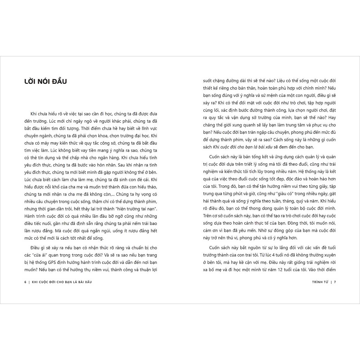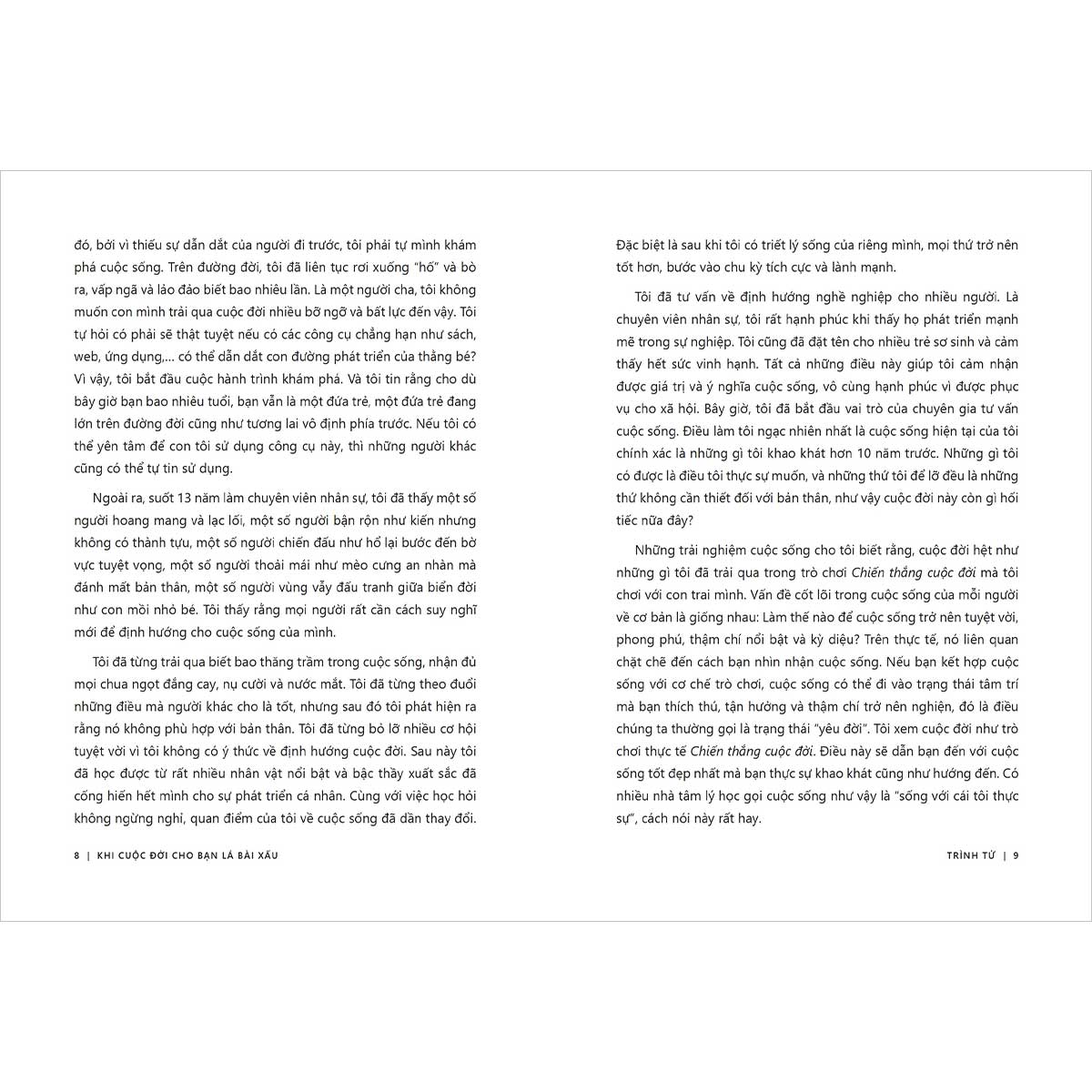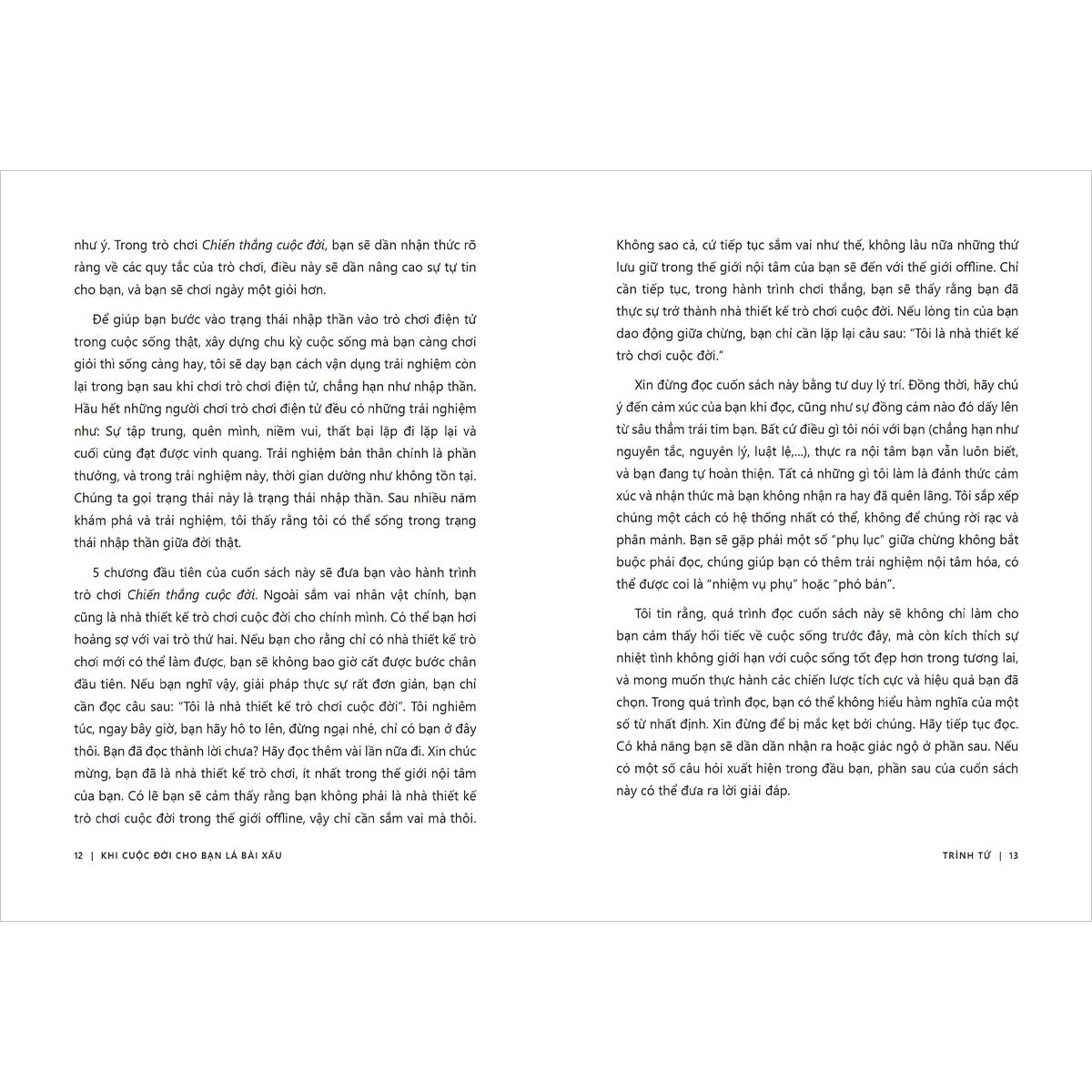 Khi cuộc đời cho bạn lá bài xấu mang đến một góc nhìn mới mẻ: tiếp cận cuộc đời bằng tư duy trò chơi. Thay vì phó mặc cho số phận, bạn sẽ học cách thiết kế “trò chơi đời mình” để vượt qua các “level” khó khăn. Sách không chỉ đưa ra lý thuyết mà còn kèm phương pháp thực hành giúp bạn rèn luyện khả năng tập trung, quản lý cảm xúc, lựa chọn bạn đồng hành và định hình thành công theo chuẩn mực riêng.