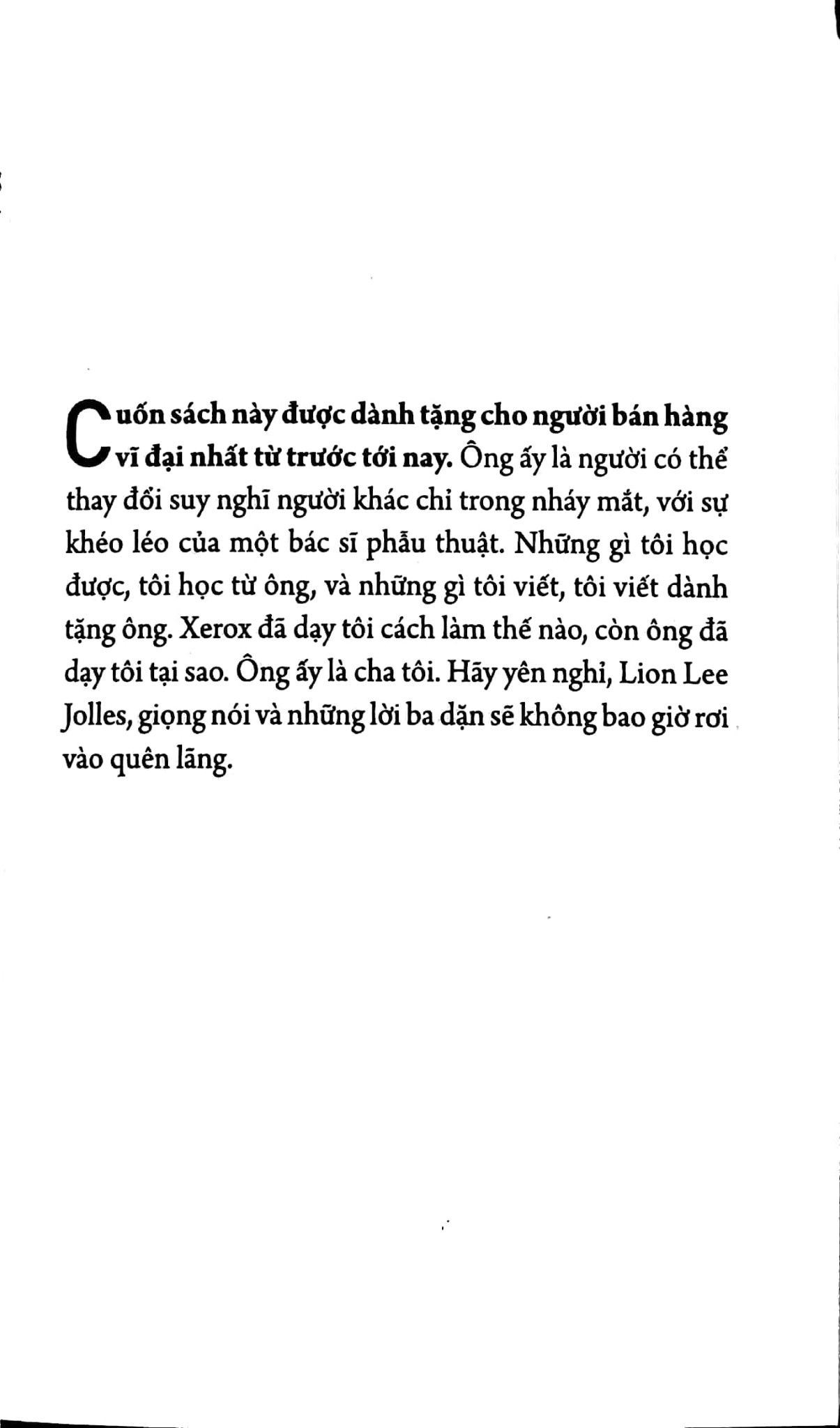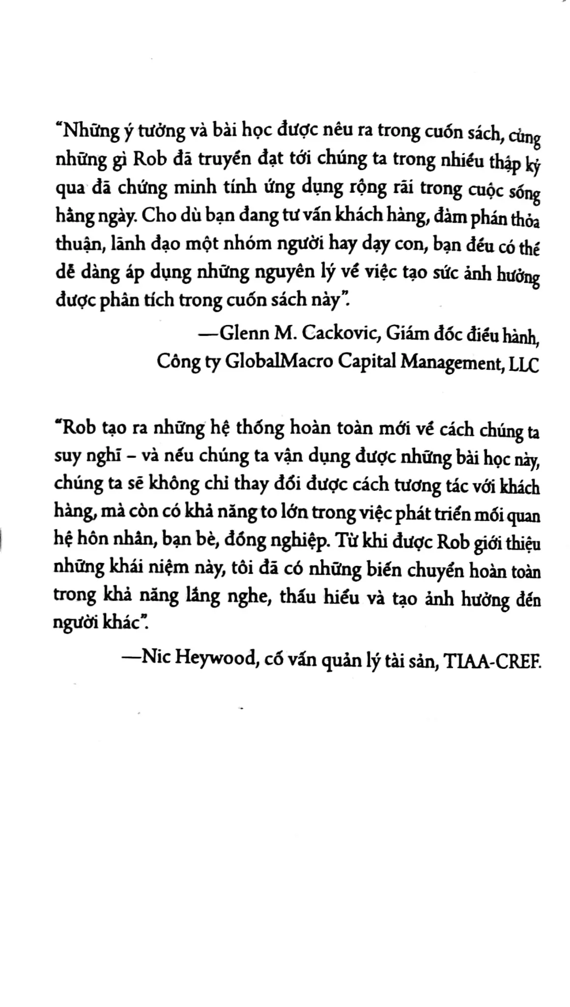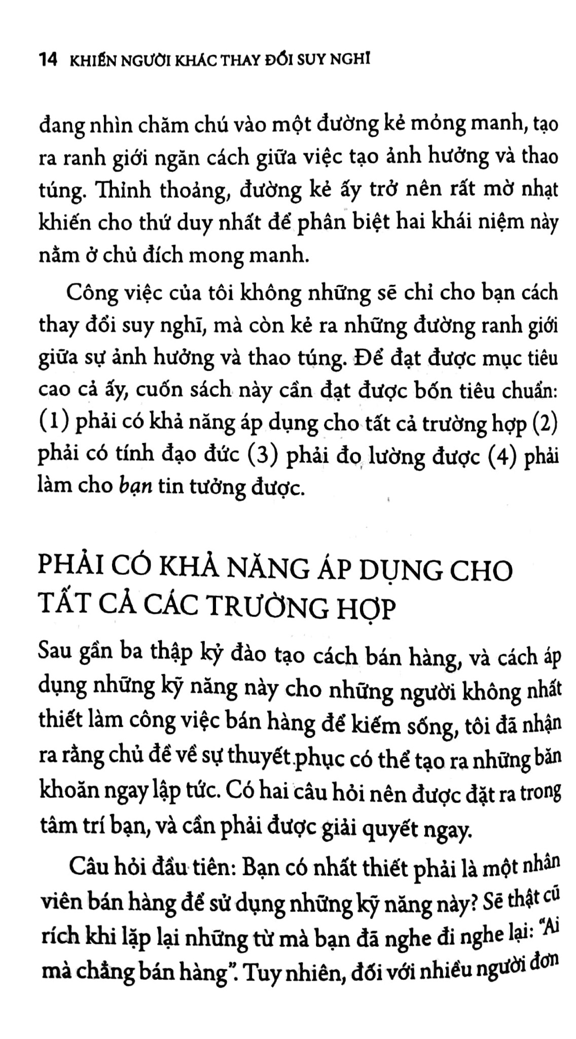 Chắc hẳn bạn biết rất nhiều người cần thay đổi điều gì đó trong cuộc sống của họ, nhưng dù bạn có cố gắng đến mấy, có ý tốt đến mấy, họ vẫn không chịu thay đổi. Bởi lẽ con người về cơ bản đều sợ thay đổi. Là một người kinh doanh, một người cha, một người bạn và cũng là một chuyên gia tư vấn, Rob Jolles hiểu rất rõ viễn cảnh ấy. Từ kinh nghiệm kinh doanh thành công và nhiều năm nghiên cứu, Rob Jolles đã đúc kết lại một công thức đơn giản giúp bạn dẫn dắt những người khác tự khám phá ra họ cần thay đổi những gì và vì sao. Có thể bạn muốn bán được hàng, cũng có thể bạn đang muốn cải thiện một mối quan hệ, dù có là gì thì những lời khuyên hữu ích của Jolles, cùng với những câu chuyện ví dụ thông minh, cảm động và hài hước của anh sẽ giúp bạn hiểu rằng thay đổi suy nghĩ của một ai đó là một hành động xuất phát từ sự quan tâm và tình cảm, cũng như từ niềm tin chắc chắn vào chính bản thân bạn.