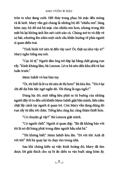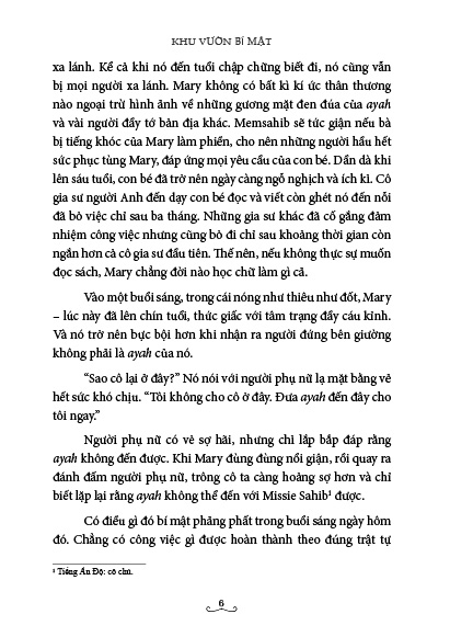 Không còn người thân nương tựa, cô được gửi đến sống với người chú, ông Craven, sống ở Anh, người sở hữu trang viên Misselthwaite Manor rộng lớn. Nơi đây cũng chứa đựng nhiều điều hết sức thú vị và khác xa Ấn Độ - nơi cô nhóc đang sống.