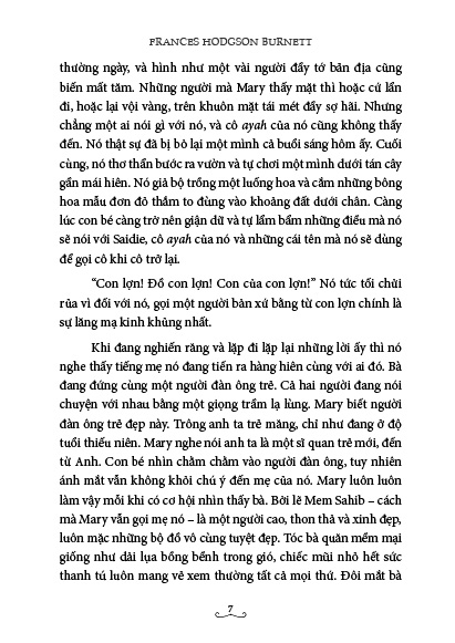 Frances Hodgson Burnett (1849-1924) là một tiểu thuyết gia và nhà viết kịch người Mỹ gốc Anh. Bà được biết đến với bộ ba tiểu thuyết nổi tiếng dành cho thiếu nhi: Công tử nhỏ Fauntleroy, Công chúa nhỏ và Khu vườn bí mật.