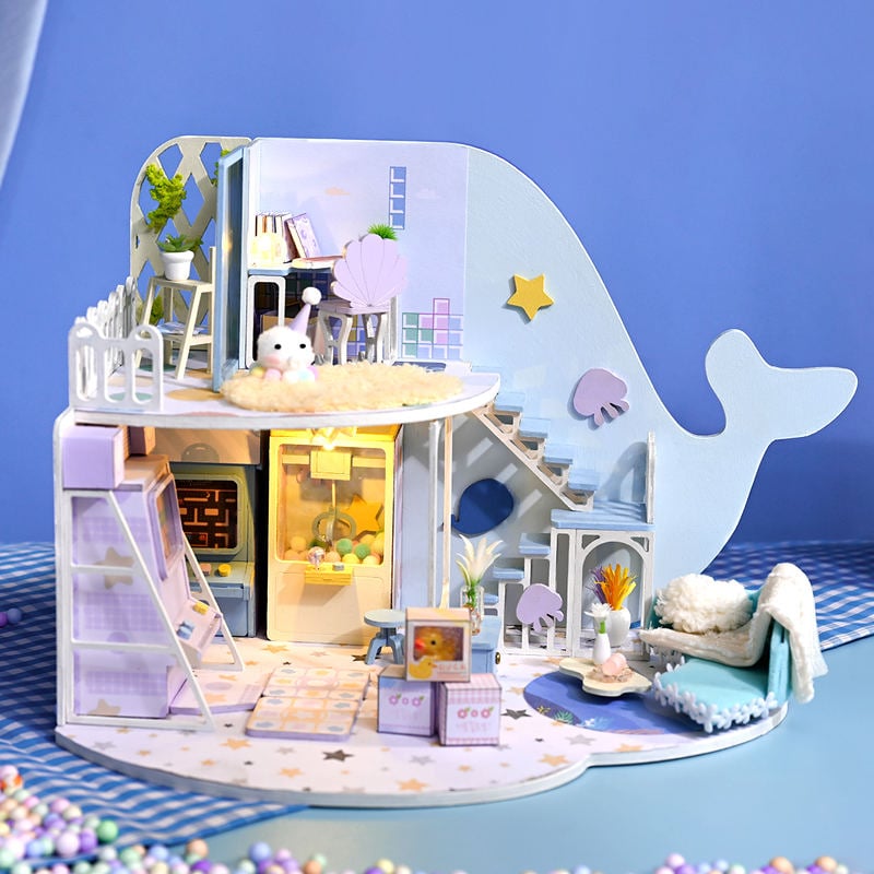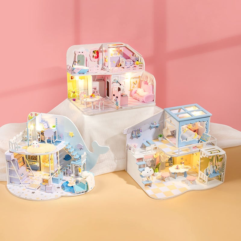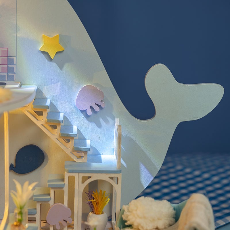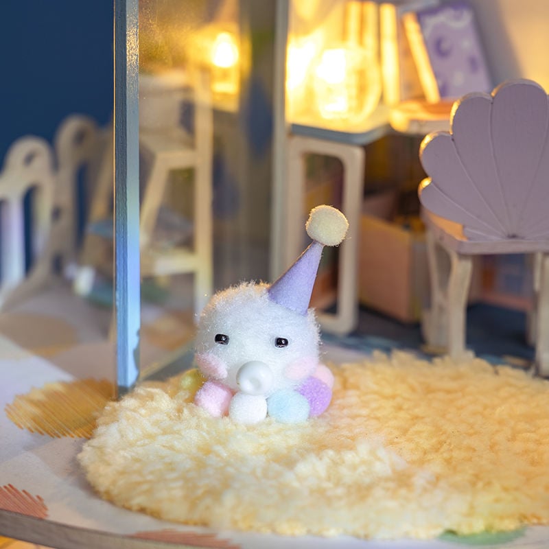 - Tất cả đồ nội thất và phụ kiện trong hình, đèn LED đã được kèm trong sản phẩm. Ánh đèn vàng làm ngôi nhà búp bê trở nên ấp áp và lãng mạn hơn