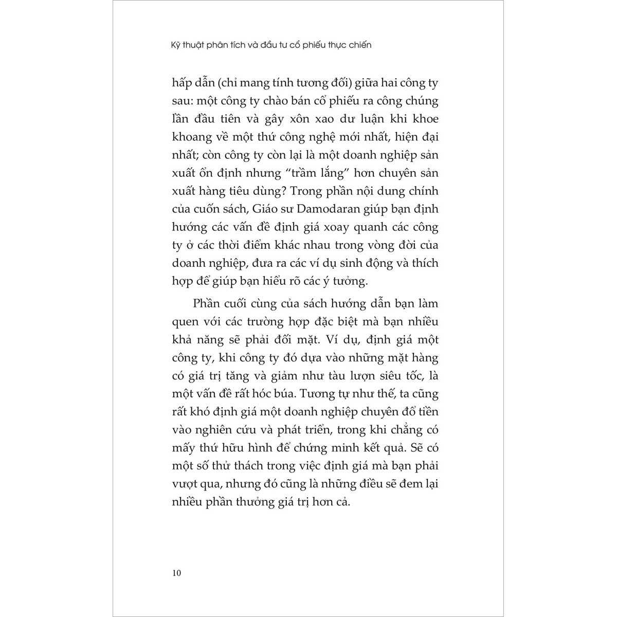 Cuốn sách còn chứa đựng nhiều ví dụ thực tiễn về cách Damodaran định giá các công ty thuộc mọi lĩnh vực và giai đoạn phát triển, từ đó rút ra kinh nghiệm quý báu cho chính mình. Những chỉ dẫn đáng tin cậy trong cuốn sách này không chỉ giúp bạn tự tin hơn khi định giá doanh nghiệp, mà còn tạo nền tảng để hiểu rõ và đánh giá các phân tích từ người khác - qua đó gia tăng lợi thế trên thị trường chứng khoán.