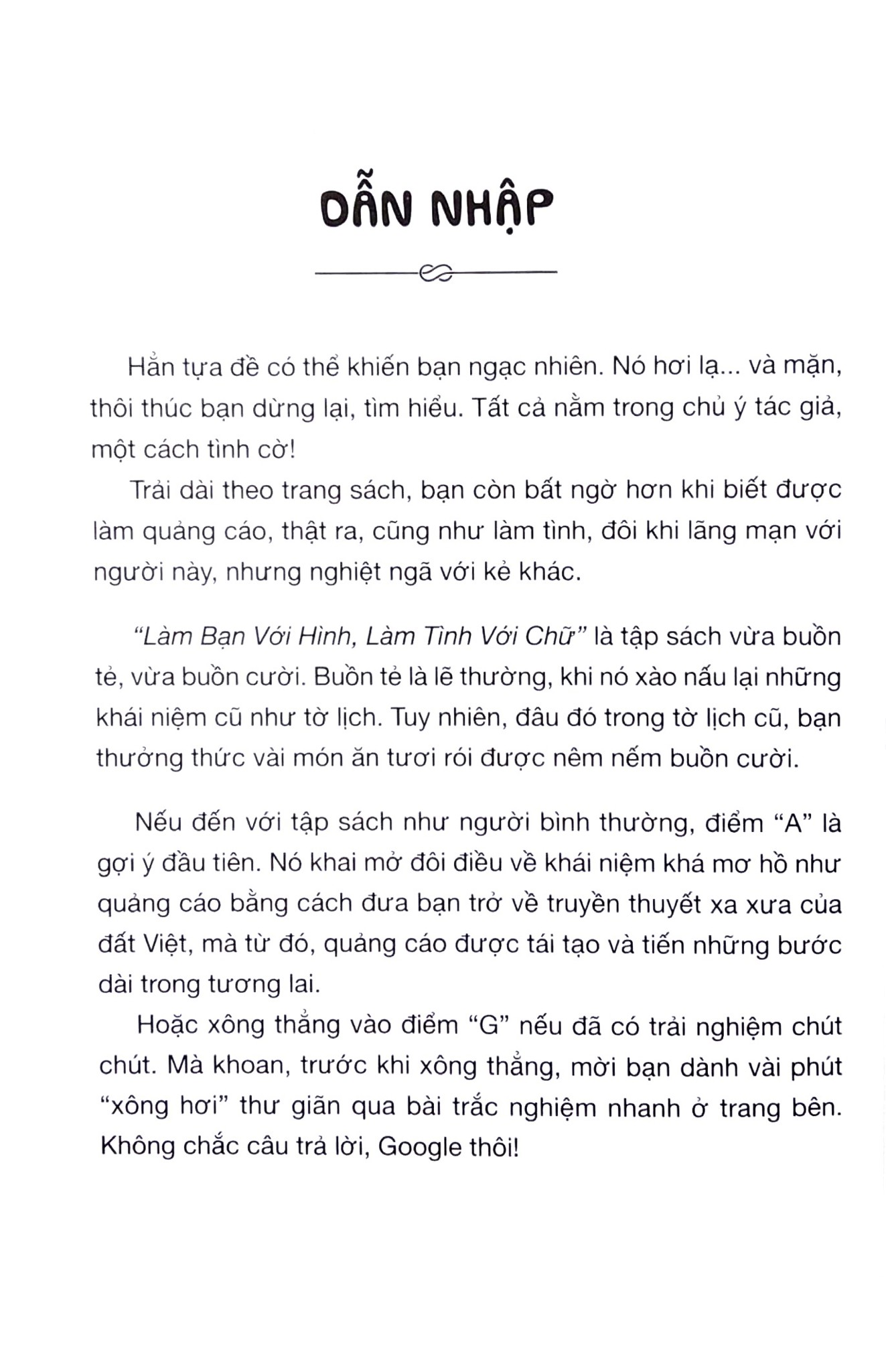 Nếu bạn chưa từng nghe qua công việc của một copywriter, chưa từng biết đến cái “sướng khổ” của người làm sáng tạo, Làm Bạn Với Hình, Làm Tình Với Chữ là cuốn sách nên đọc. Rất nên đọc.