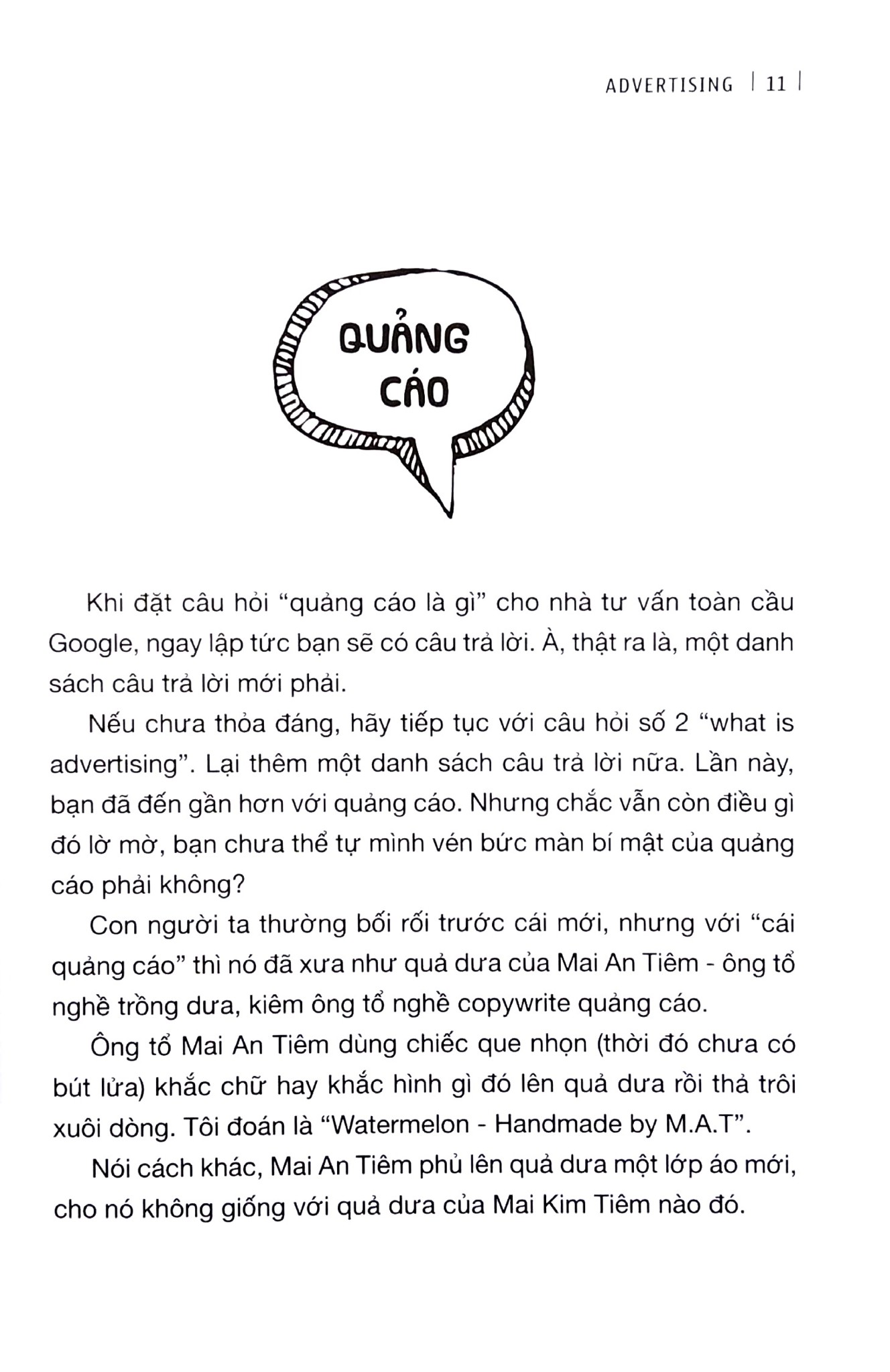 Một cuốn sách với tựa đề hơi lạ và cũng hơi… "mặn", được giới thiệu là “Viết bởi copywriter “8 tuổi”. Vẽ bởi copywriter “18 tuổi”. Không lý thuyết khô khan. Không giáo điều sáo rỗng. Cuốn sách như chuyến viễn du về Miền Quảng Cáo đầy háo hức và rạo rực. Hai mươi sáu chữ. Hai mươi sáu hình. Hai mươi sáu trạm dừng chân. Đang đợi một hành khách.