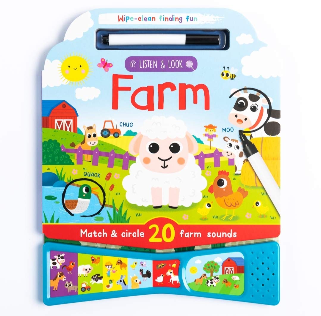 Who says MOO? What goes CHUG-CHUG? Listen to the sounds, then find and circle each thing you hear! Discover 20 noises in this interactive book, full of farmyard fun.