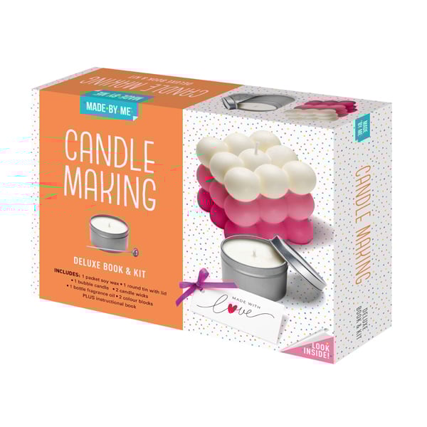 The candle making kit includes an instruction manual, soy wax, bubble candle mould, tin with lid, wicks, fragrance oil and 2 colour blocks.