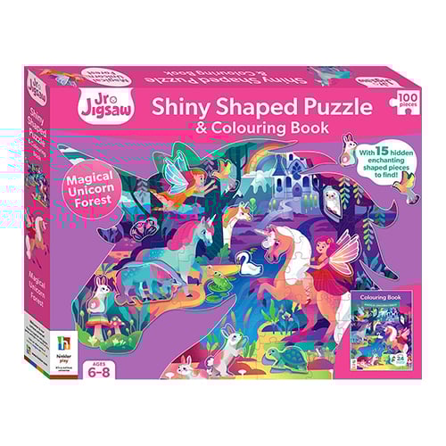Kids can enter a world of fun with this shiny unicorn-shaped jigsaw! This 100-piece puzzle features an enchanted forest filled with magical unicorns and fairies, and it includes 15 delightful hidden shaped pieces!
