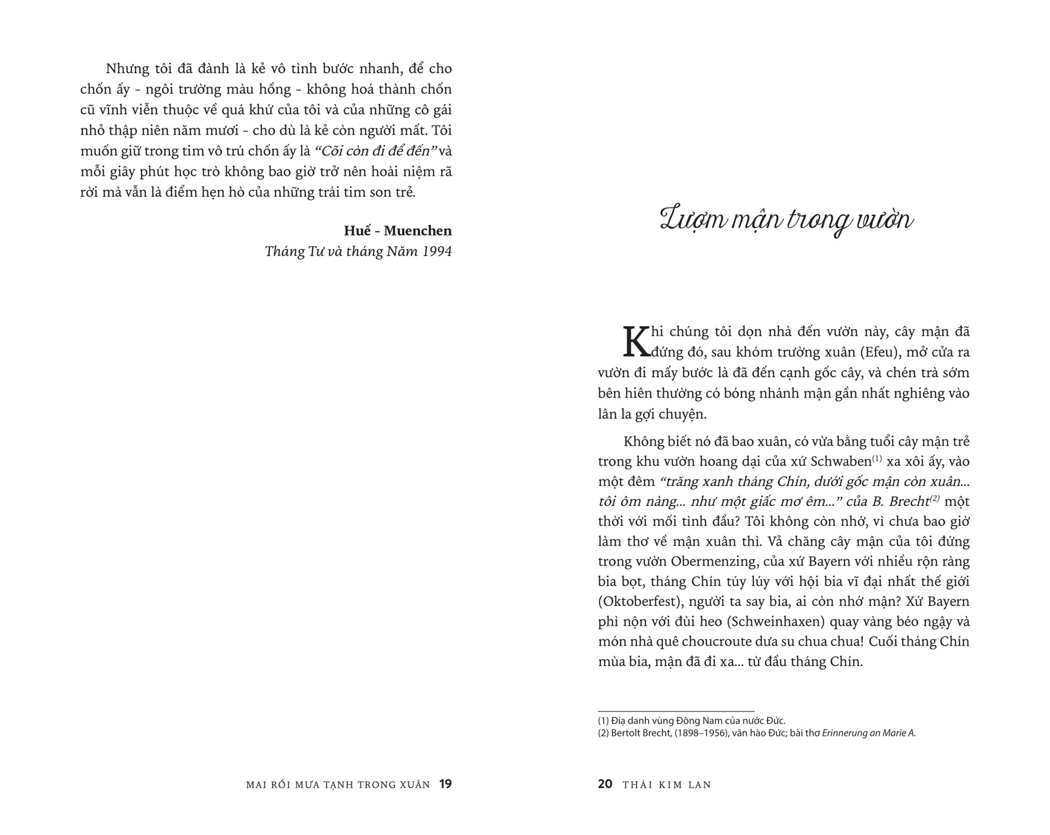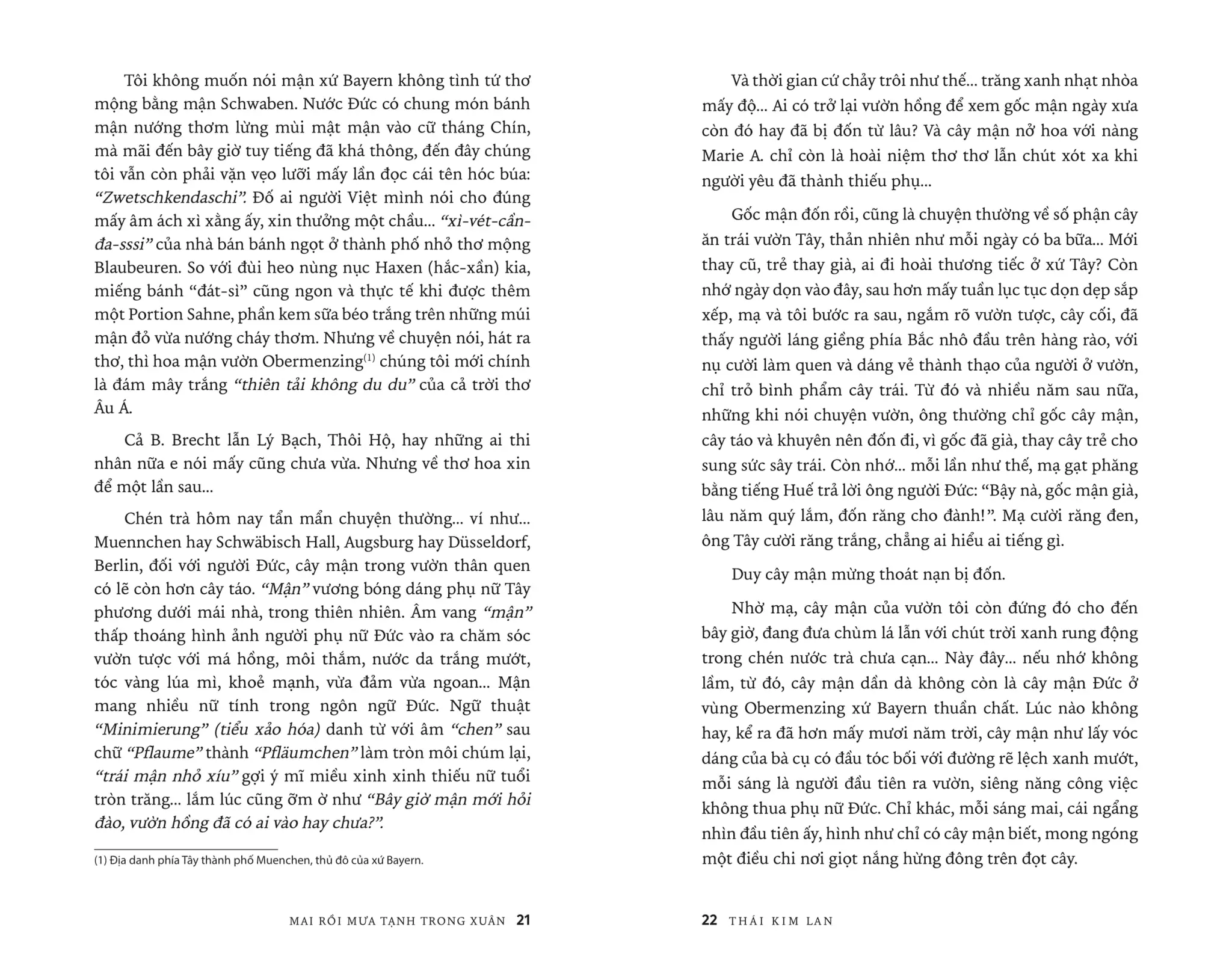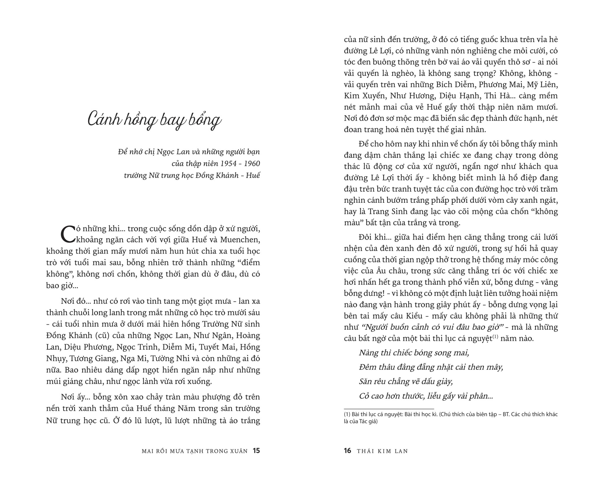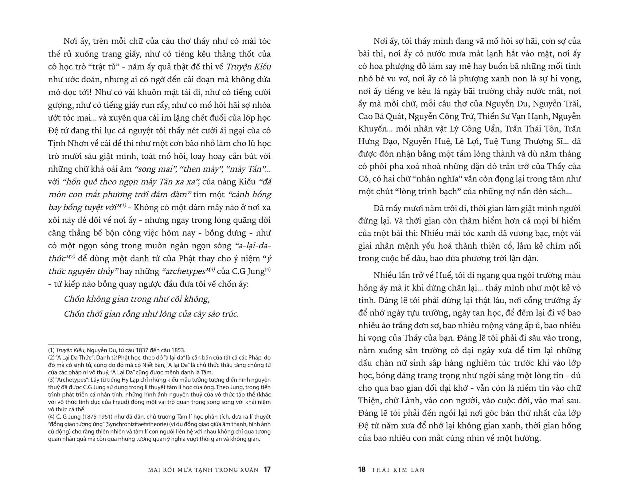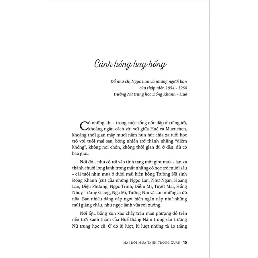 Huế, của kí ức trẻ thơ, của tuổi xanh mến thương. Huế của Mạ, của Bà, của Em, của Chị... của hoa, của núi, của sông... của tất cả những người yêu dấu trong ngày Phật Đản, lễ Vu Lan, dịp Nguyên đán vừa lạ, vừa quen...Gần gũi bên dòng Hương giang hiền dịu hay xa mãi bên góc trời Âu nhưng tâm thức vẫn lay động, xôn xao khi chợt nhớ về tiếng chuông chùa thoảng ngân, cánh hoa hải đường bé bỏng, sắc lá biếc, màu áo quyến tinh khôi... Lần bước theo cảm xúc trong tản văn Thái Kim Lan, người đọc sẽ cùng Tác giả vào Đường Sương, qua Đường Mưa để dần ngộ ra giữa chốn nhung nhớ ảo huyền ấy một MAI RỒI MƯA TẠNH TRONG XUÂN...