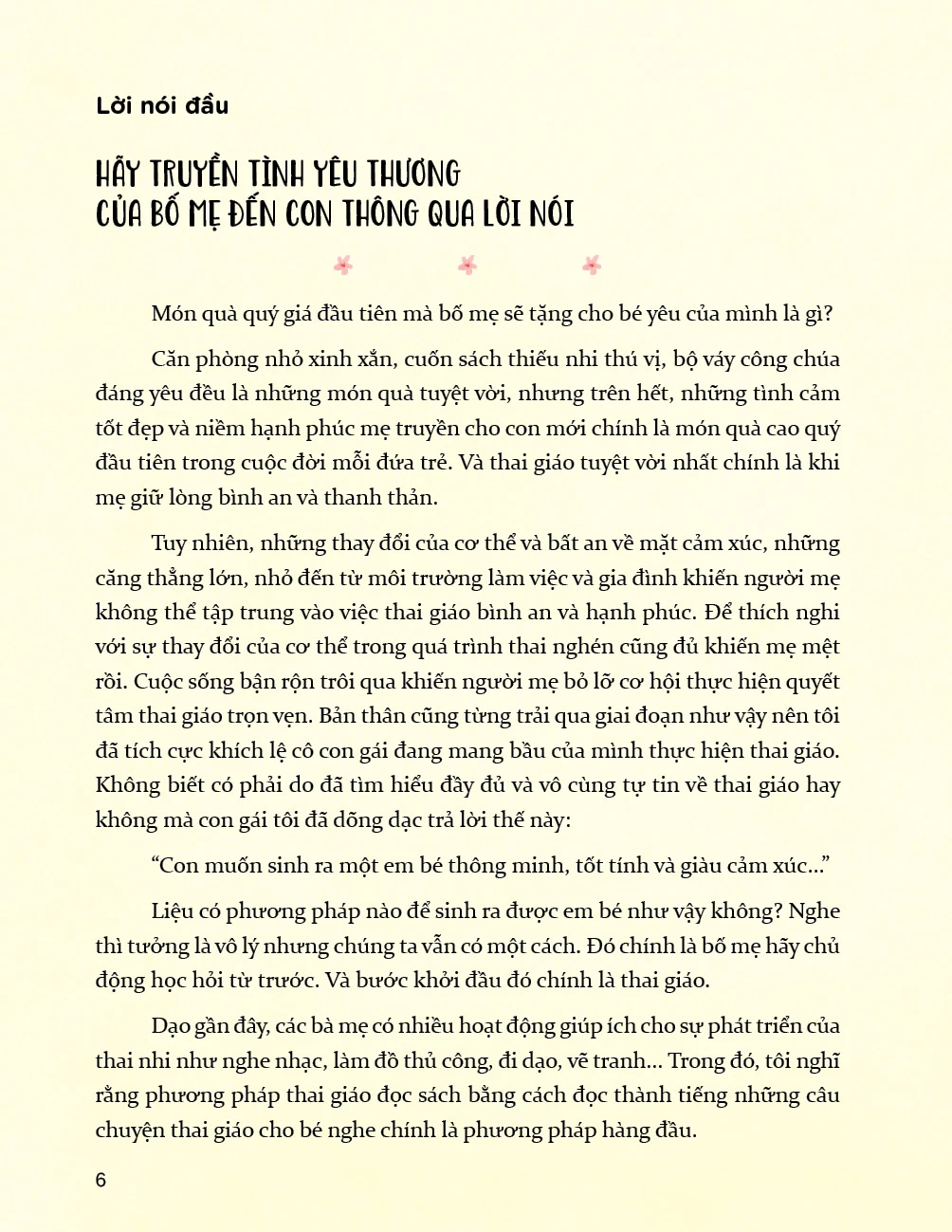 Là một chuyên gia giáo dục, một người mẹ và một người bà, tác giả người Hàn Quốc Park Hannah đã giúp các bậc cha mẹ có được phương pháp thai giáo hiệu quả và dễ dàng thông qua hoạt động đọc thành tiếng những câu chuyện thai giáo cho bé nghe.