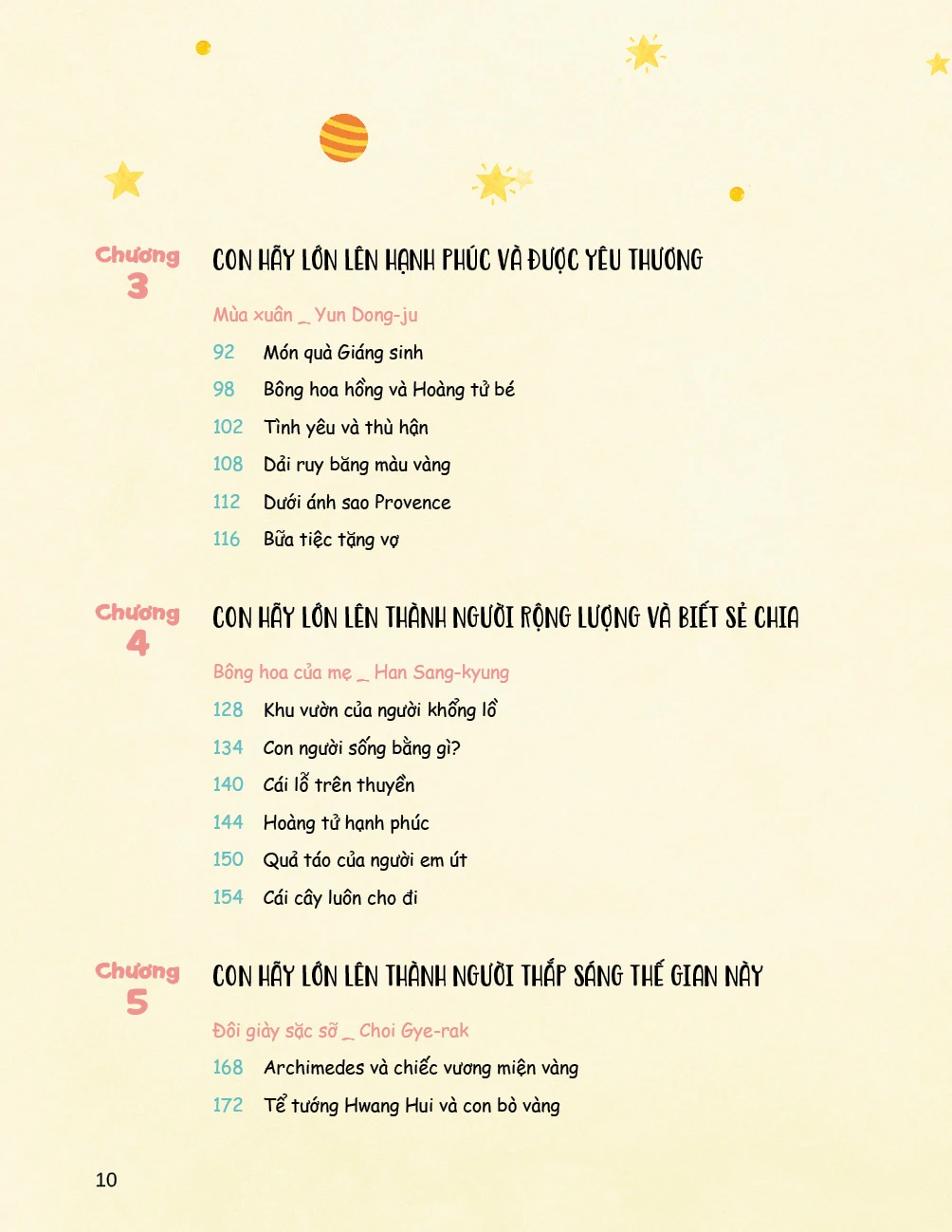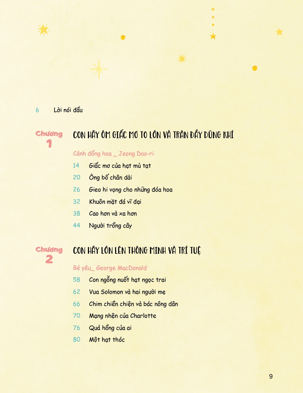 Cuốn sách được chia thành 5 chương tương đương với 5 thông điệp mà tác giả muốn thay lời của cha mẹ nhắn nhủ đến em bé. Trong mỗi chương gồm có 6 câu chuyện thiếu nhi đáng yêu như Giấc mơ của hạt mù tạt, Ông bố chân dài, Bông hoa hồng và Hoàng tử bé, Dưới ánh sao Provence,… giúp mẹ vừa đọc giải trí vừa kể cho con nghe. Ở đầu và cuối mỗi truyện, tác giả đều đưa ra những lời dẫn dắt và những bài học lay động lòng người, dạt dào tình yêu thương và như một lời nhắn nhủ để thì thầm với con.