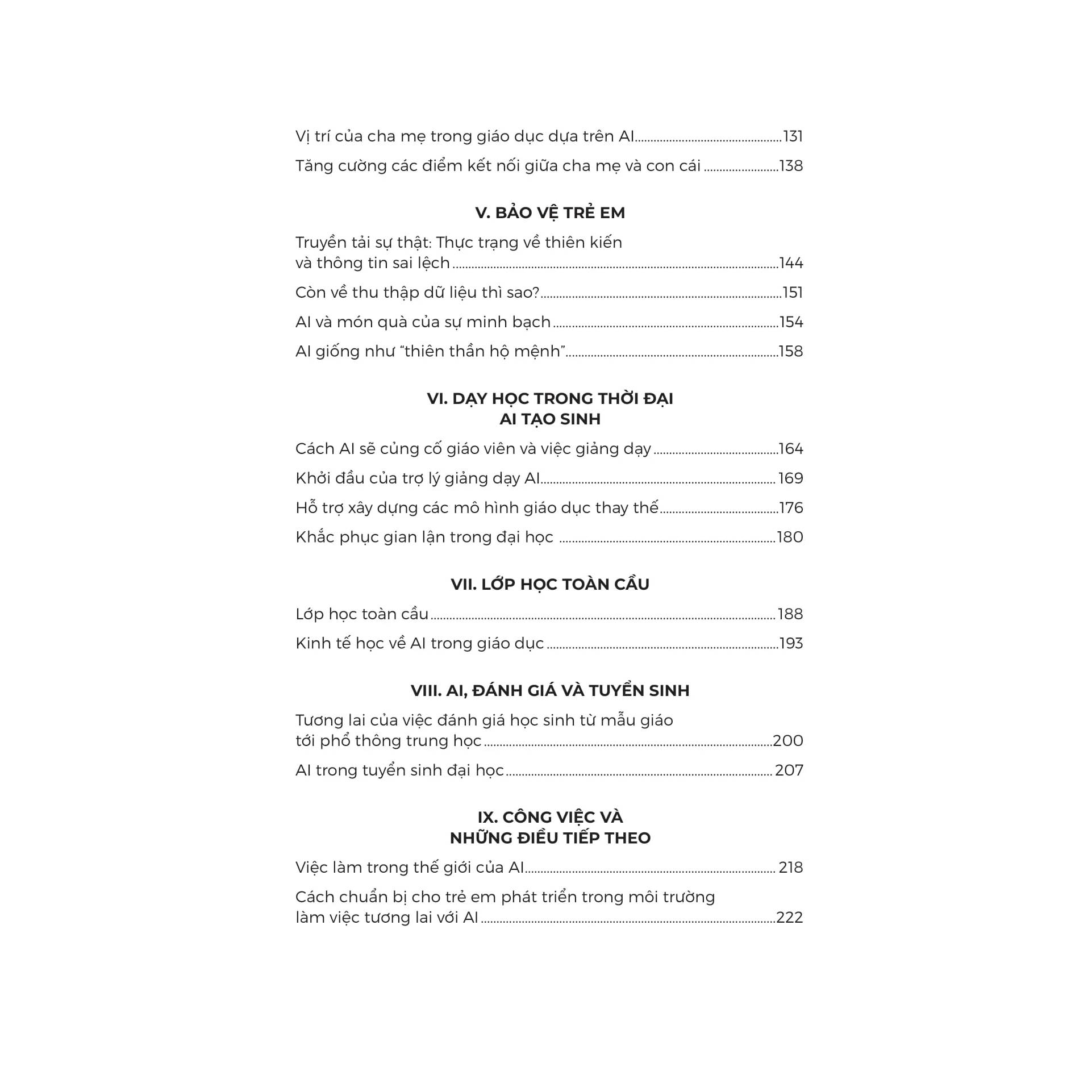 #5. Cuốn sách phù hợp với cả đối tượng ngoài lĩnh vực giáo dục: Không chỉ dành cho phụ huynh và giáo viên, cuốn sách còn là tài liệu tham khảo hữu ích cho các nhà quản lý giáo dục, các cố vấn nghề nghiệp, và nhà tuyển dụng muốn áp dụng AI vào đào tạo và phát triển kỹ năng của học sinh, sinh viên, và nhân viên trong tương lai.