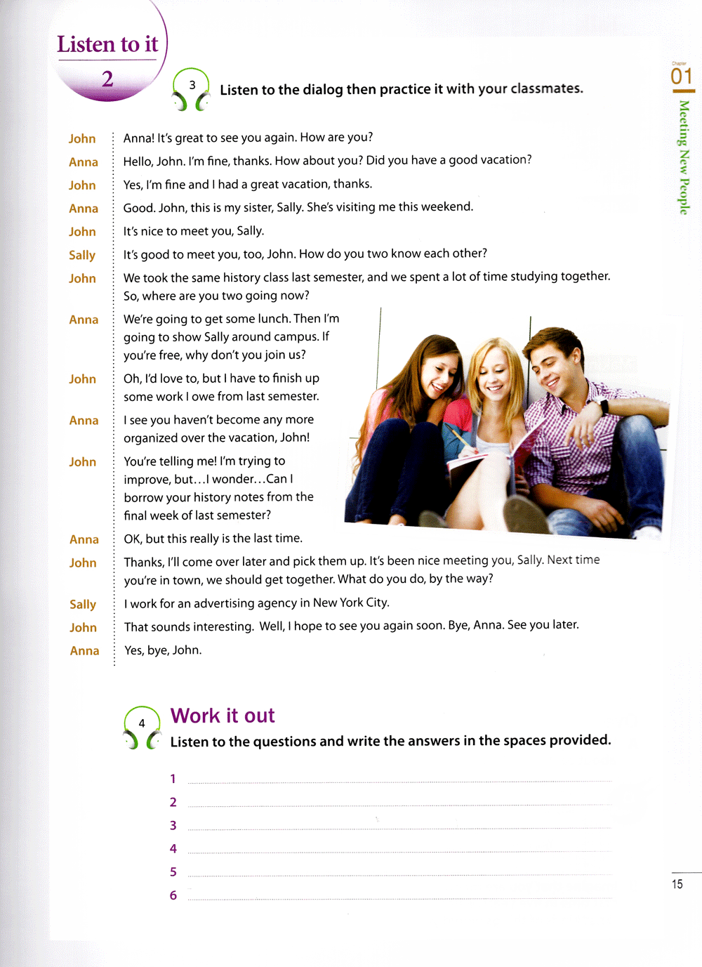 Lively, authentic dialogs and situations employing essential words and expressions