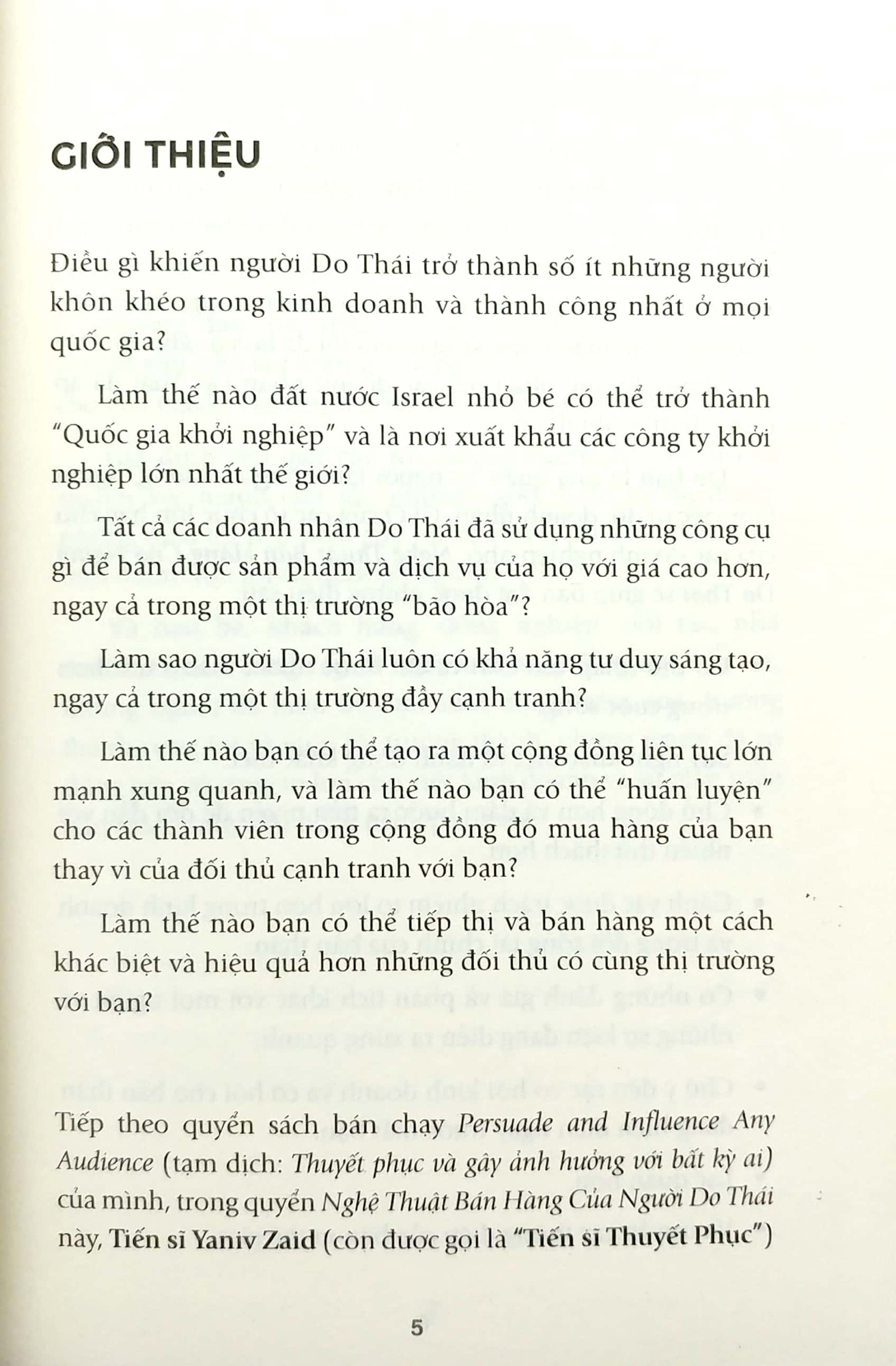 Được mệnh danh là "quốc gia khởi nghiệp", Israel là nơi sản sinh ra nhiều doanh nhân thành công trong nhiều lĩnh vực và ở mọi quốc gia. Để làm được điều này, người Do Thái đã tiếp thu và thấm nhuần những triết lý và công cụ để tạo dựng uy tín, xây dựng và duy trì một cộng đồng khách hàng trung thành, thực hiện marketing sáng tạo và tối đa hóa doanh số cho công ty của mình – những phương pháp mà người Do Thái đã áp dụng từ rất lâu. Tất cả những điều này sẽ được tác giả Yaniv Zaid chia sẻ và lý giải trong quyển sách Nghệ Thuật Bán Hàng Của Người Do Thái.