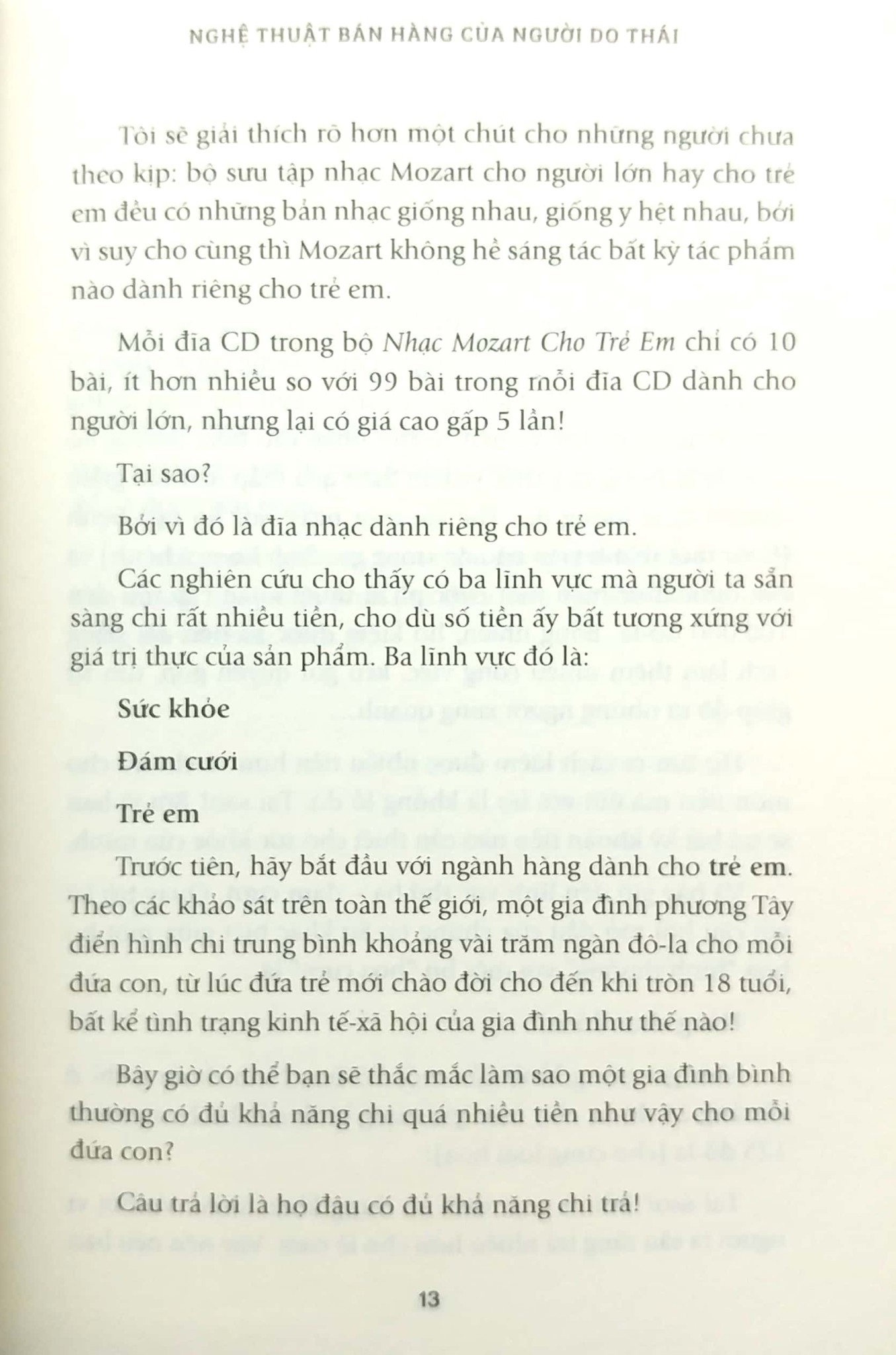 Qua những mẩu chuyện nhỏ và nhiều ví dụ thực tế trong quyển sách này, bạn đọc sẽ lần lượt tìm được câu trả lời cho những câu hỏi mà một chuyên gia marketing, một nhân viên bán hàng hay bất kỳ ai muốn nâng cao kỹ năng thương thuyết đều có thể quan tâm, chẳng hạn như "Làm thế nào để bán được sản phẩm và dịch vụ với giá cao ngay cả trong một thị trường bão hòa?", "Làm sao để thúc đẩy người khác mua hàng của bạn kể cả khi họ không có ý định đó?", "Làm thế nào để quảng bá và bán hàng hiệu quả hơn đối thủ cạnh tranh?"... Khi đọc quyển sách này, bạn sẽ thấy rằng những chân lý và triết lý thành công không nằm ở đâu xa mà hiện diện và được ứng dụng ngay trong đời sống hằng ngày, trong những lần bạn tự hỏi "Điểm khác biệt giữa một bó hoa cưới và một bó hoa bình thường là gì?" hay "Tại sao người ta thường phục vụ bữa ăn nhẹ trong một sự kiện?".