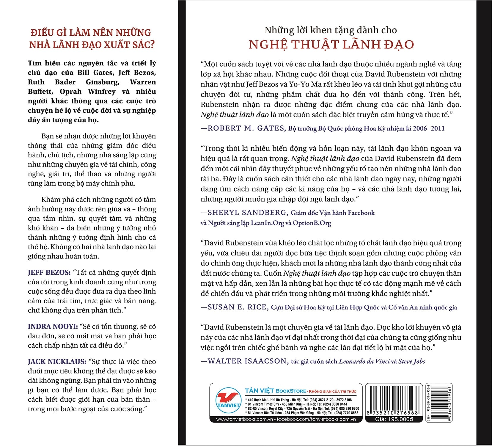 Đó là một loạt những câu hỏi mà David M. Rubenstein – một chuyên gia hàng đầu trong lĩnh vực tài chính và là nhà từ thiện nổi tiếng – đã đặt ra khi tiến hành những cuộc phỏng vấn với những vị lãnh đạo trong các lĩnh vực khác nhau. Ông muốn khai thác những trải nghiệm lãnh đạo cùng kinh nghiệm hết sức quý giá của các giám đốc điều hành, chủ tịch, người sáng lập và những người đi đầu trong ngành tài chính, công nghệ và giải trí, chính trị gia và các nhà lãnh đạo tư tưởng để hiểu sâu hơn về các nguyên tắc, tầm nhìn và triết lý lãnh đạo của họ. Sau khi hoàn thành những cuộc phỏng vấn, ông đã đúc kết chúng thành cuốn Nghệ Thuật Lãnh Đạo này như một ngọn hải đăng, để từ đó độc giả học được những bài học thực tiễn đầy giá trị từ những thế hệ đi trước.