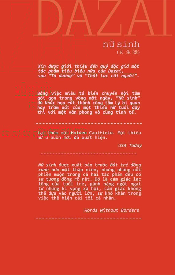 Cũng như Nữ Sinh, sự tinh tế trong việc miêu tả tâm lý phụ nữ của Dazai một lần nữa được thể hiện qua truyện “Nữ tác gia”. Tâm lý của một cô gái nuôi mộng văn chương hiện ra thật sinh động và thú vị vô cùng.
