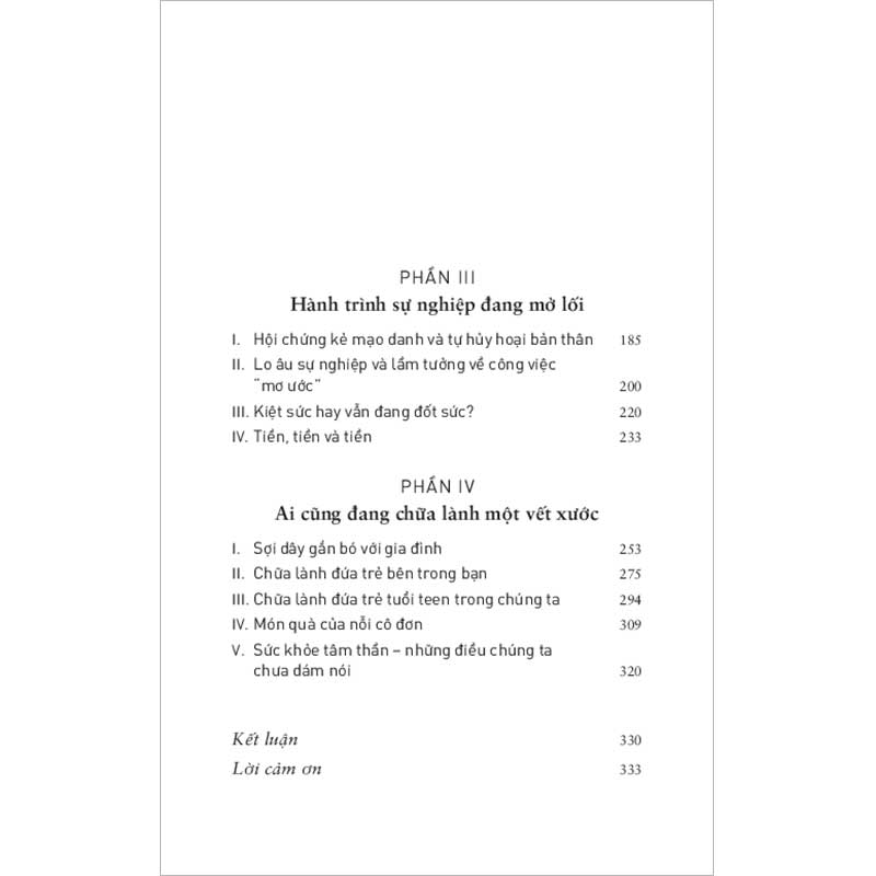 Với 4 phần lớn, lấy chủ đề lần lượt từ bản thân, tình yêu, sự nghiệp và chữa lành, sách điểm qua hầu hết các vấn đề nổi bật, ảnh hưởng sâu sắc đến người trẻ hiện đại, từ việc đối mặt với hội chứng kẻ mạo danh, chấp nhận thất bại rủi ro, tránh xa các mối quan hệ độc hại, cho đến khám phá đứa trẻ bên trong, xây dựng sự nghiệp và hàn gắn vết thương lòng. Nhằm đồng hành cùng sự phát triển của bạn đọc, sách còn bao gồm các hướng dẫn chi tiết, lời nhắc và bài tập thực hành tư duy, cung cấp nhiều kiến thức và kỹ năng cần thiết giúp bạn đọc trẻ đối mặt với những thách thức trong công việc, cuộc sống, để dần hoàn thiện mình.