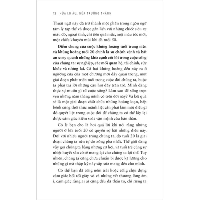 Tuổi 20, một giai đoạn đầy khó khăn và thử thách đối với bất kỳ ai, cũng là thời điểm mà ta phải nắm lấy cơ hội đắt giá nhất để định hình tương lai của chính mình. Xuất phát từ podcast “The Psychology of Your 20s” với hơn 50 triệu lượt nghe trên toàn thế giới, “Nửa lo âu, nửa trưởng thành: Hành trình tìm mình ở tuổi hai mươi” là tấm bản đồ tâm lý sâu sắc, chi tiết và thiết thực, giúp bạn đọc khám phá từng góc khuất trong tâm trí mình.