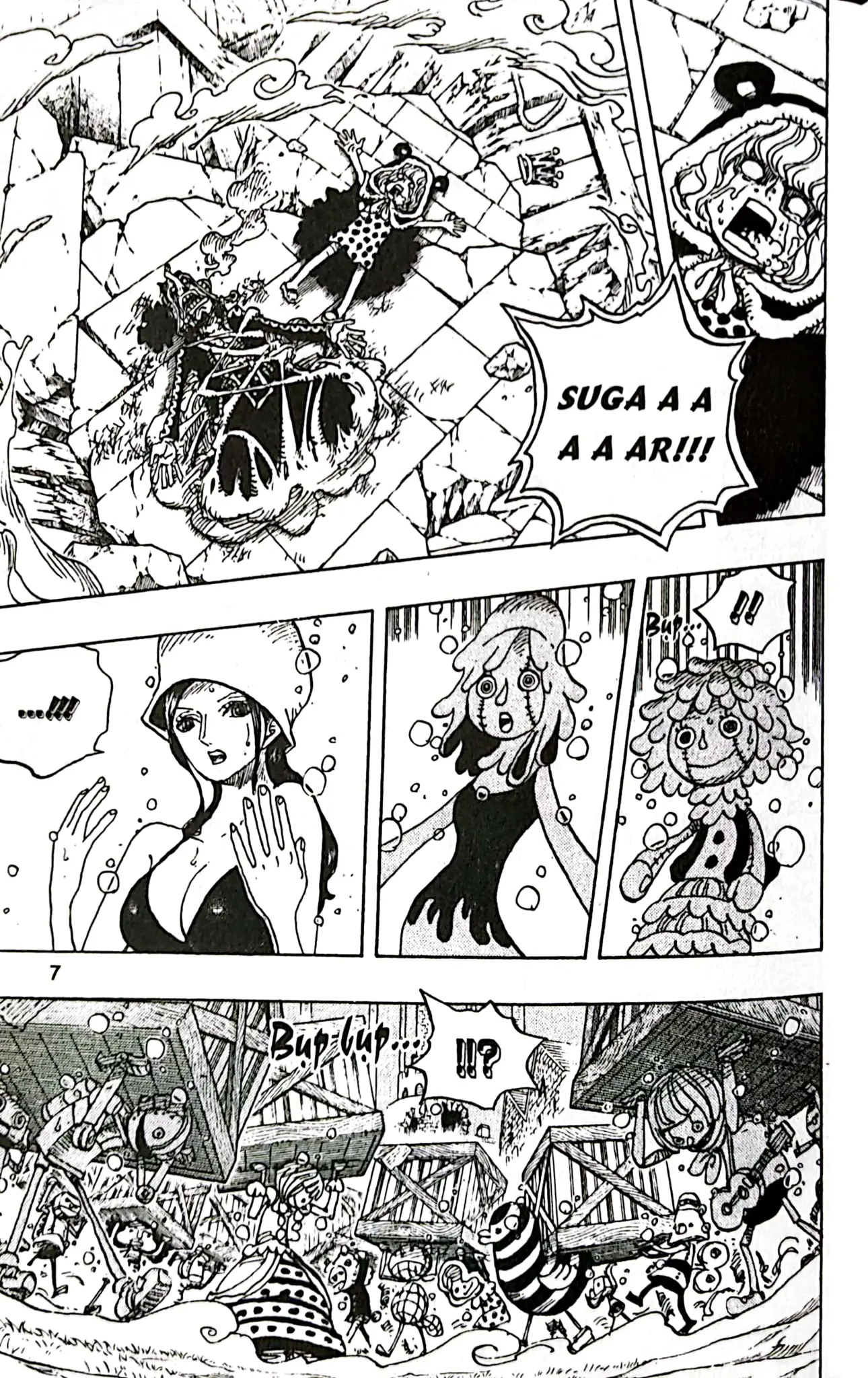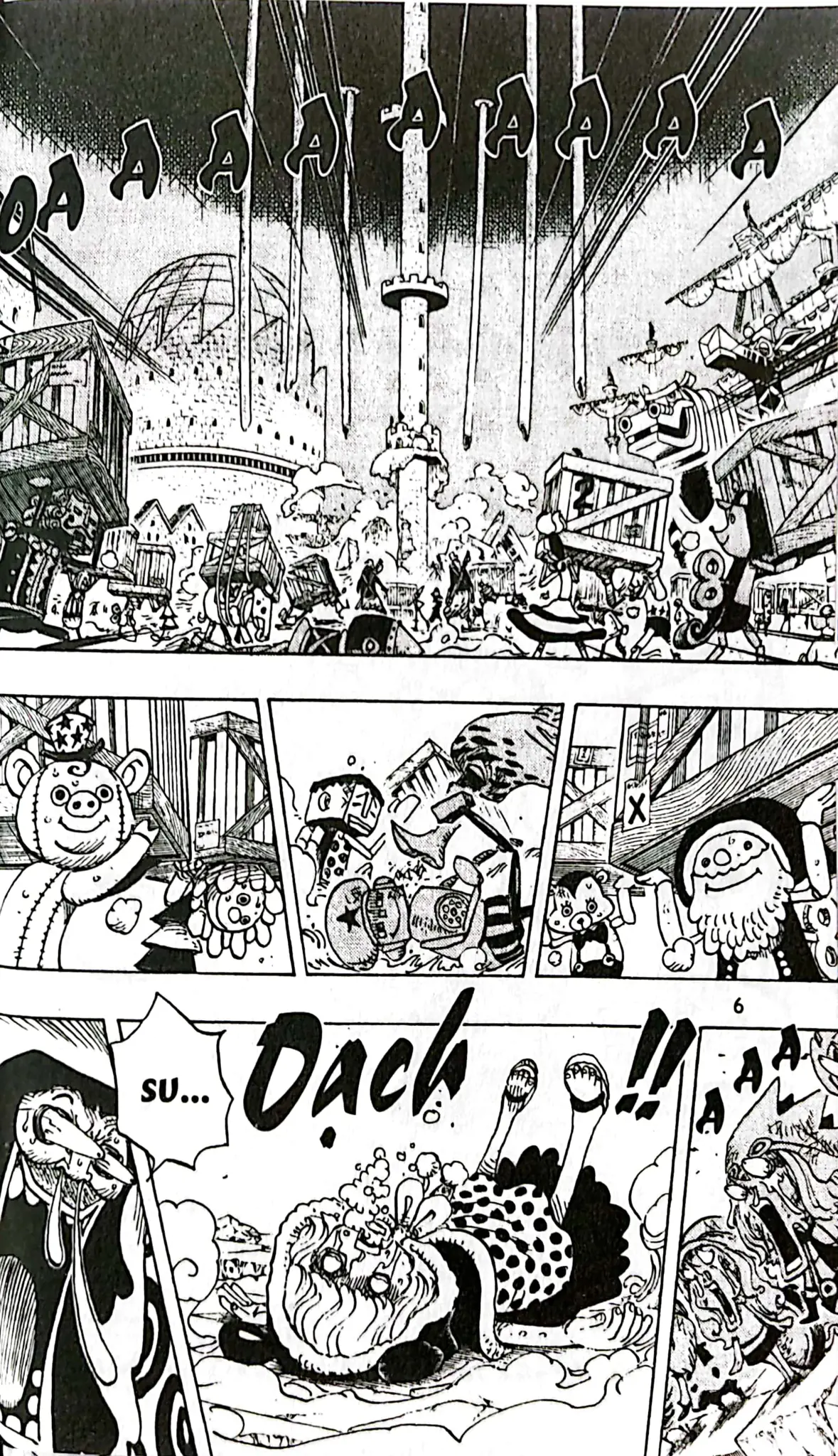 Thật bất ngờ khi Usopp đã “trổ tài” (!?) làm Sugar bất tỉnh, giúp những người biến thành đồ chơi trong vương quốc được giải phóng!! Trong cảnh hỗn loạn diễn ra trên khắp đảo, nhóm Luffy đã lên kế hoạch truy đuổi tên trùm Doflamingo!!