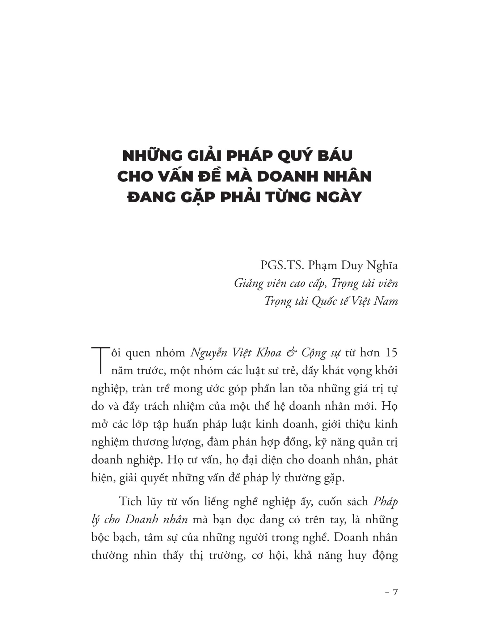 Pháp lý cho doanh nhân là cuốn cẩm nang giúp doanh nhân hiểu và vận dụng pháp luật như một công cụ chiến lược trong quản trị và phát triển doanh nghiệp. Không dừng lại ở việc dẫn chiếu điều luật, sách hệ thống hóa những vấn đề pháp lý gắn liền với thực tiễn: từ khởi nghiệp, bảo vệ quyền quyết định, gọi vốn, quản lý tài sản cá nhân và doanh nghiệp, hợp đồng, giải quyết tranh chấp, đến kế thừa và chuyển giao doanh nghiệp. Tác giả – những luật sư nhiều năm kinh nghiệm – đã đúc rút từ hàng trăm tình huống tư vấn để mang đến các bài học gần gũi, giúp doanh nhân phòng ngừa rủi ro, tránh sai lầm tốn kém, và biết cách khai thác pháp luật như một “đòn bẩy” cho sự phát triển. Đây không chỉ là tài liệu hướng dẫn thủ tục, mà còn là chìa khóa để doanh nhân nâng cao năng lực quản trị, xây dựng nền móng vững chắc cho doanh nghiệp trong dài hạn.