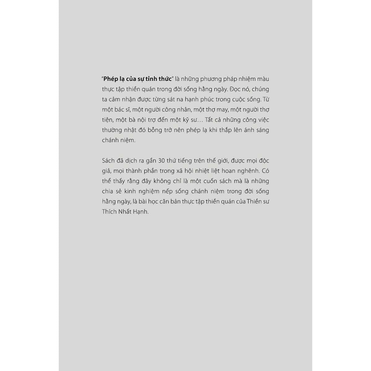 Phép Lạ Của Sự Tỉnh Thức là những phương pháp nhiệm mầu thực tập thiền quán trong đời sống hàng ngày. Đọc nó, chúng ta cảm nhận được từng sát na hạnh phúc trong cuộc sống. Từ một bác sĩ, một người công nhân, một thợ may, một người thợ tiện, một bà nội trợ đến một kỹ sư... Tất cả những công việc thường nhật đó bỗng trở nên phép lạ khi thắp lên ánh sáng chánh niệm.