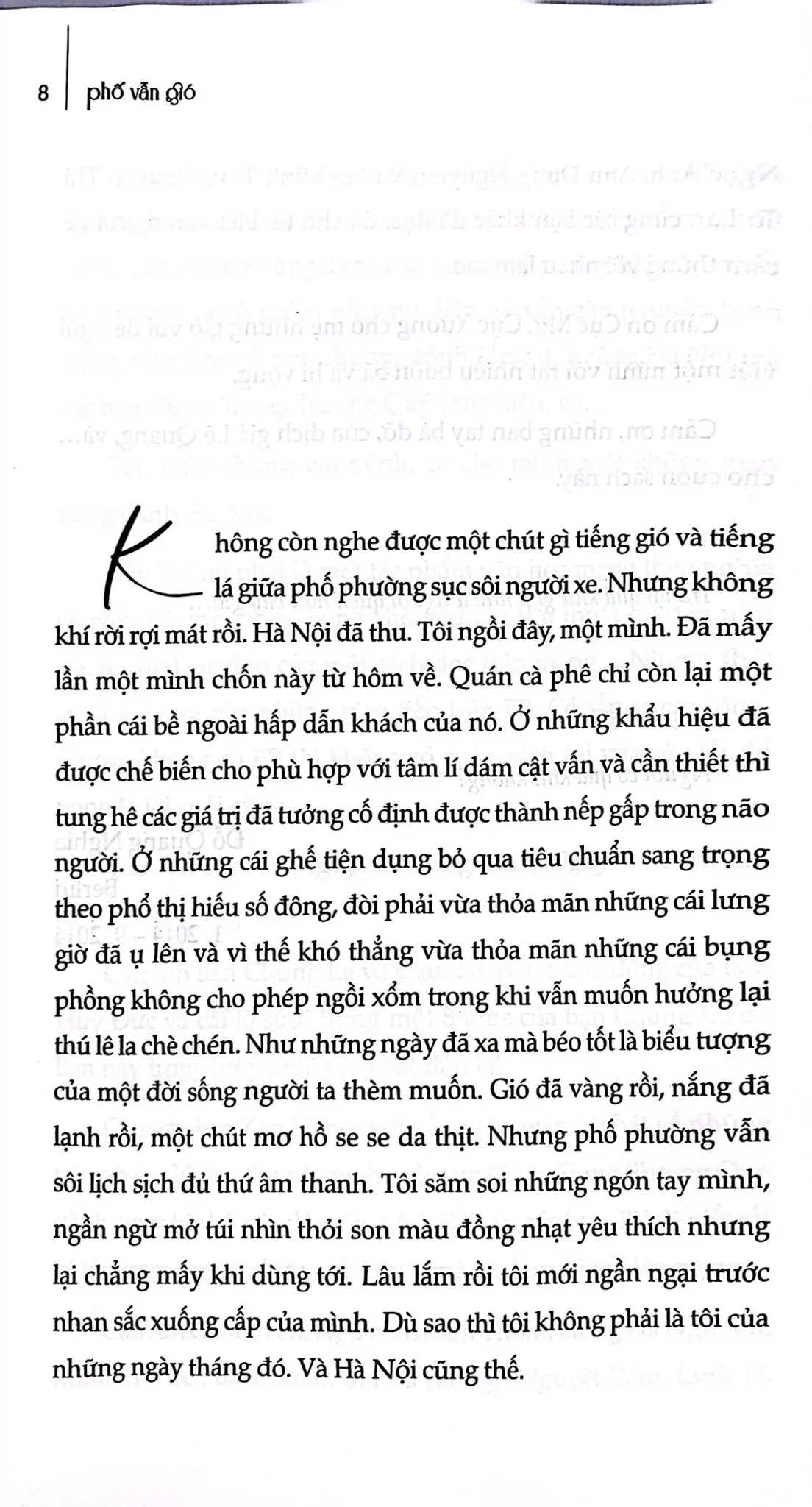 “Phố vẫn gió” lấy bối cảnh Hà Nội từ những năm sau giải phóng 1954 tới nay. Sự đối lập của Hà Nội cũ và Hà Nội hậu chiến là bức tranh đầy cảm xúc mà Lê Minh Hà dựng lên. Có cảm giác sự đau đớn của nhân vật Ngân khi chứng kiến những đổi thay của Hà Nội cũng có bóng dáng của chính chị, một người Hà Nội sống xa Hà Nội đã nhiều năm.