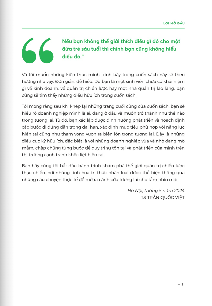 Với nhiều năm kinh nghiệm chinh chiến trên thương trường và bằng lối viết chân phương, TS Trần Quốc Việt đưa người đọc đi khám phá thế giới của quản trị chiến lược “thực chiến” qua nhiều chặng lý thuyết, công cụ và câu chuyện thực tế.