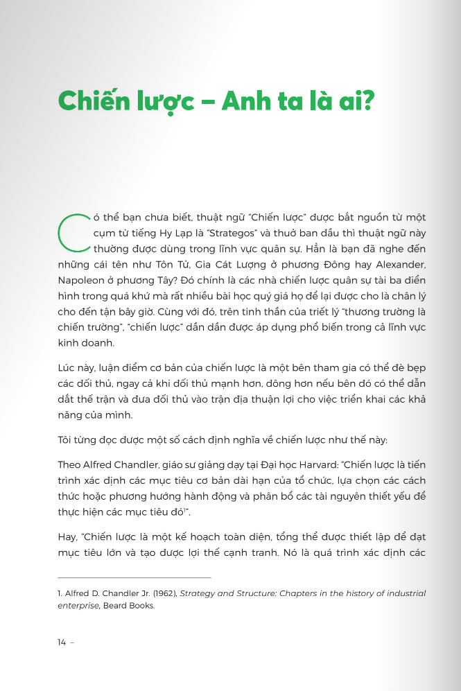 Tác giả dành hai chương đầu sách để giới thiệu lần lượt những khái niệm cơ bản như “chiến lược và tư duy chiến lược”, “tầm nhìn và mục tiêu”, “giá trị cốt lõi”, v.v. đi kèm ví dụ dễ hiểu. Bốn chương tiếp theo đi vào giới thiệu, phân tích và minh họa rất nhiều công cụ hữu ích cho doanh nghiệp và lãnh đạo doanh nghiệp trong việc xây dựng và thực thi chiến lược; có thể kể ra Mô hình Value Chain, Ma trận IFE và EFE, Mô hình PESTEL, Ma trận SWOT, Ma trận ANSOFF… Chương VII cũng là chương cuối cùng có thể được coi là phần mở rộng, nâng cao để người đọc tìm đáp án cho câu hỏi “Tại sao phải thay đổi?”, đồng thời suy ngẫm về việc phát triển bền vững để hướng tới tương lai.