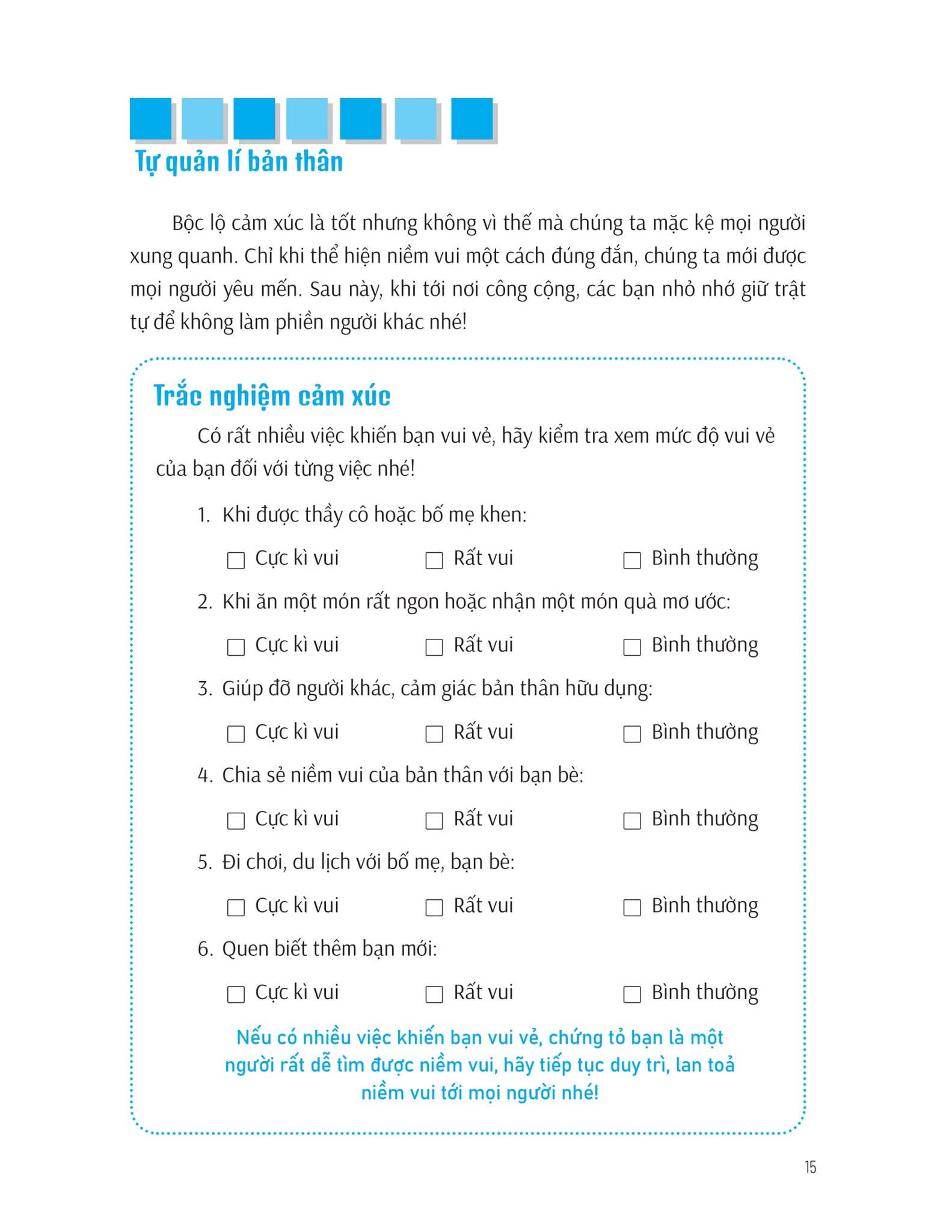 Cảm xúc là một con dao hai lưỡi. Trong tình huống cấp bách, nó sẽ khởi động chế độ đề phòng, nhắc nhở chúng ta tự bảo vệ bản thân, nhưng nếu lưỡi dao quá bén, nó cũng sẽ làm tổn thương chúng ta. Cảm xúc có thể được quản lí và điều chỉnh cho phù hợp. Khi biết cách chung sống với cảm xúc, tức là chúng ta đã nắm lấy "chìa khóa cảm xúc" rồi đó.