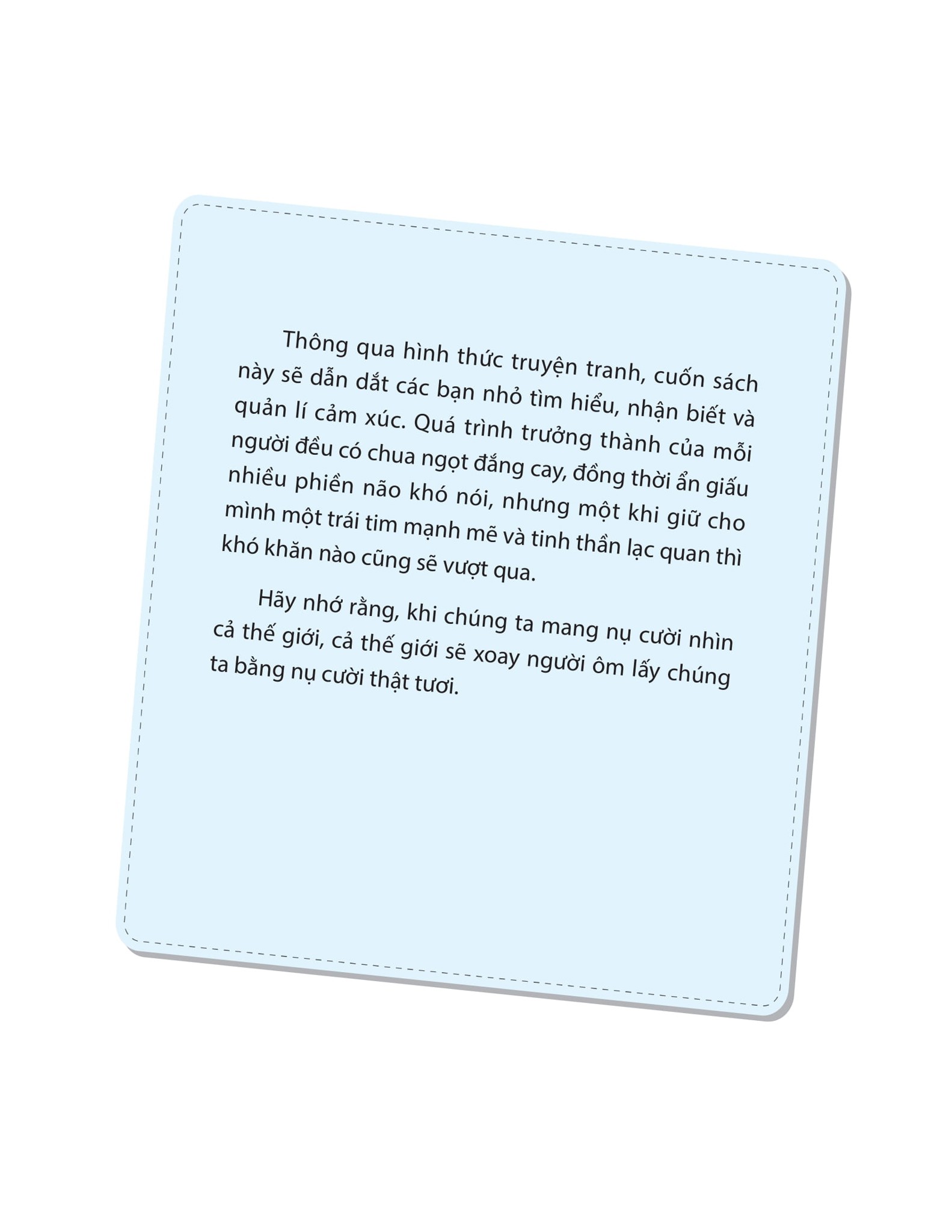 Thông qua hình thức truyện tranh, cuốn sách này sẽ dẫn dắt các bạn nhỏ tìm hiểu, nhận biết và quản lí cảm xúc. Quá trình trưởng thành của mỗi người đều có chua ngọt cay đắng, đồng thời ẩn giấu nhiều phiền não khó nói, nhưng một khi giữ cho mình một trái tim mạnh mẽ và tinh thần lạc quan thì khó khăn nào cũng sẽ vượt qua.