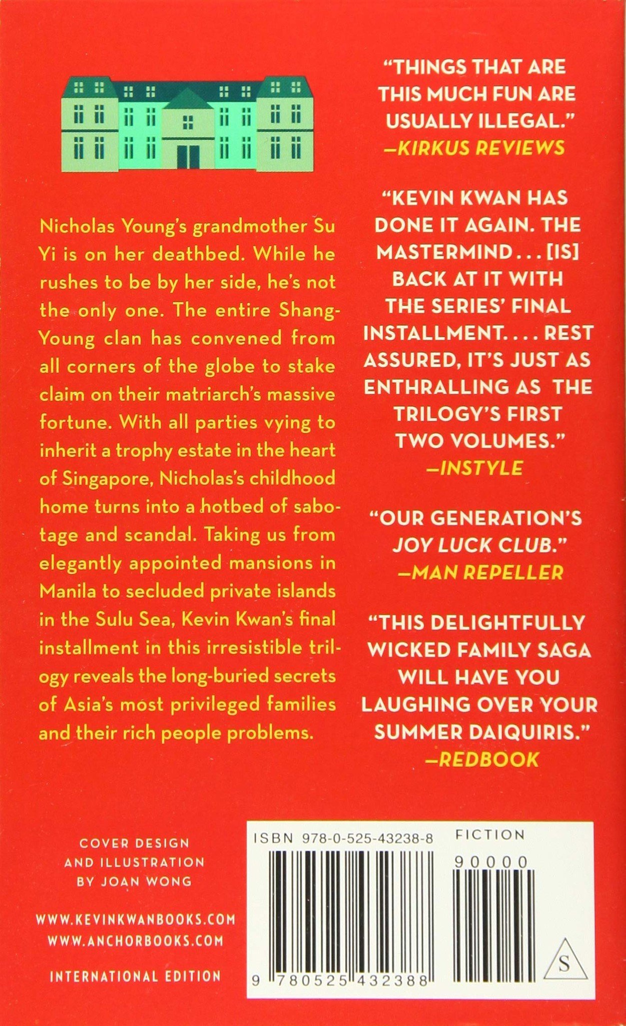 When Nicholas Young hears that his grandmother, Su Yi, is on her deathbed, he rushes to be by her bedside—but he's not alone. The entire Shang-Young clan has convened from all corners of the globe to stake claim on their matriarch’s massive fortune. With each family member vying to inherit Tyersall Park—a trophy estate on 64 prime acres in the heart of Singapore—Nicholas’s childhood home turns into a hotbed of speculation and sabotage. As her relatives fight over heirlooms, Astrid Leong is at the center of her own storm, desperately in love with her old sweetheart Charlie Wu, but tormented by her ex-husband—a man hell bent on destroying Astrid’s reputation and relationship. Meanwhile Kitty Pong, married to China’s second richest man, billionaire Jack Bing, still feels second best next to her new step-daughter, famous fashionista Colette Bing. A sweeping novel that takes us from the elegantly appointed mansions of Manila to the secluded private islands in the Sulu Sea, from a kidnapping at Hong Kong’s most elite private school to a surprise marriage proposal at an Indian palace, caught on camera by the telephoto lenses of paparazzi, Kevin Kwan's hilarious, gloriously wicked new novel reveals the long-buried secrets of Asia's most privileged families and their rich people problems.