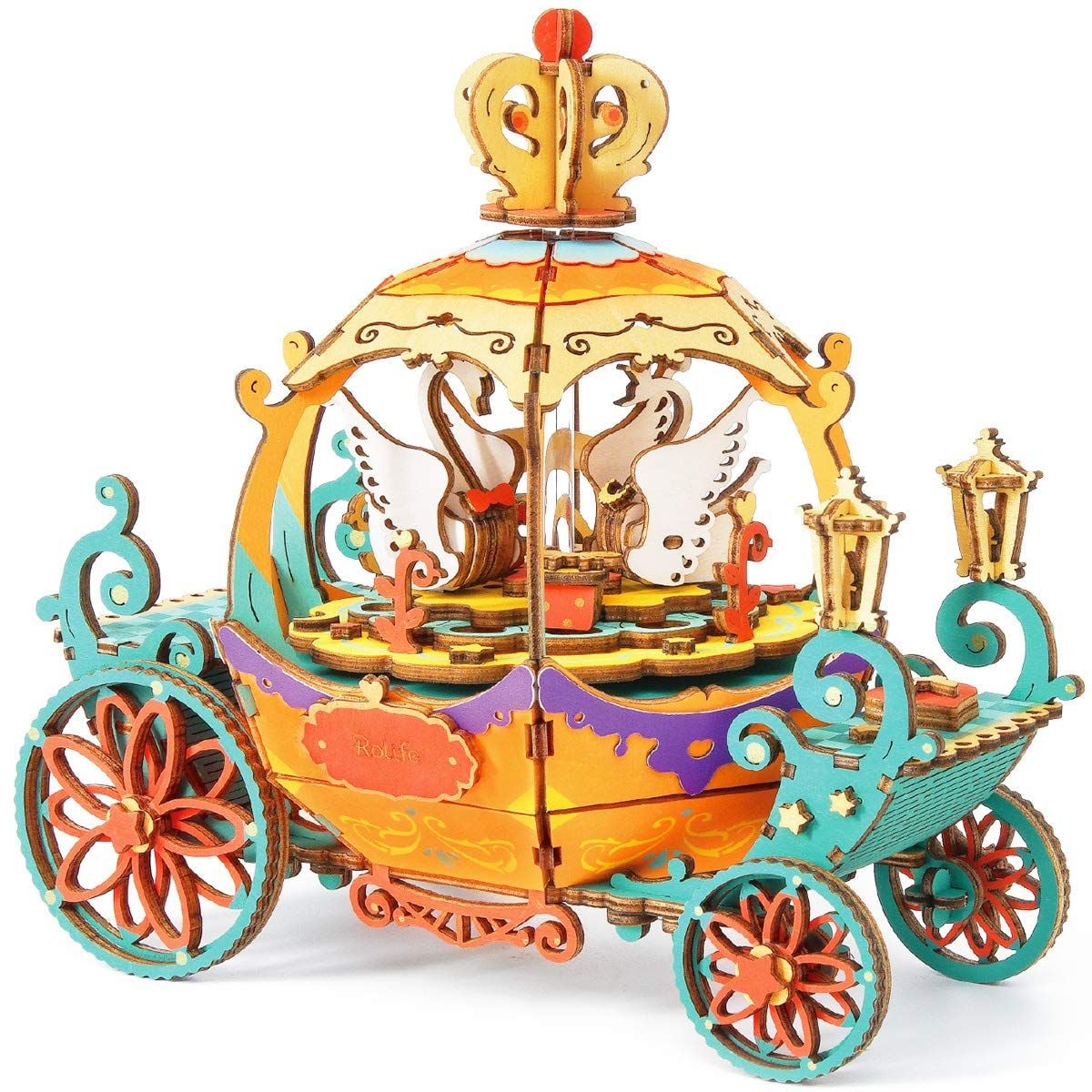 - Thiết kế cổ tích lãng mạn: Mô hình tái hiện chiếc xe bí ngô (xe ngựa) với những đường nét tinh xảo, màu sắc tươi sáng (phiên bản màu hỗn hợp) hoặc màu gỗ tự nhiên. Các chi tiết trang trí hình thiên nga và bánh xe hoa văn mang lại vẻ đẹp thanh lịch, phù hợp để trang trí.