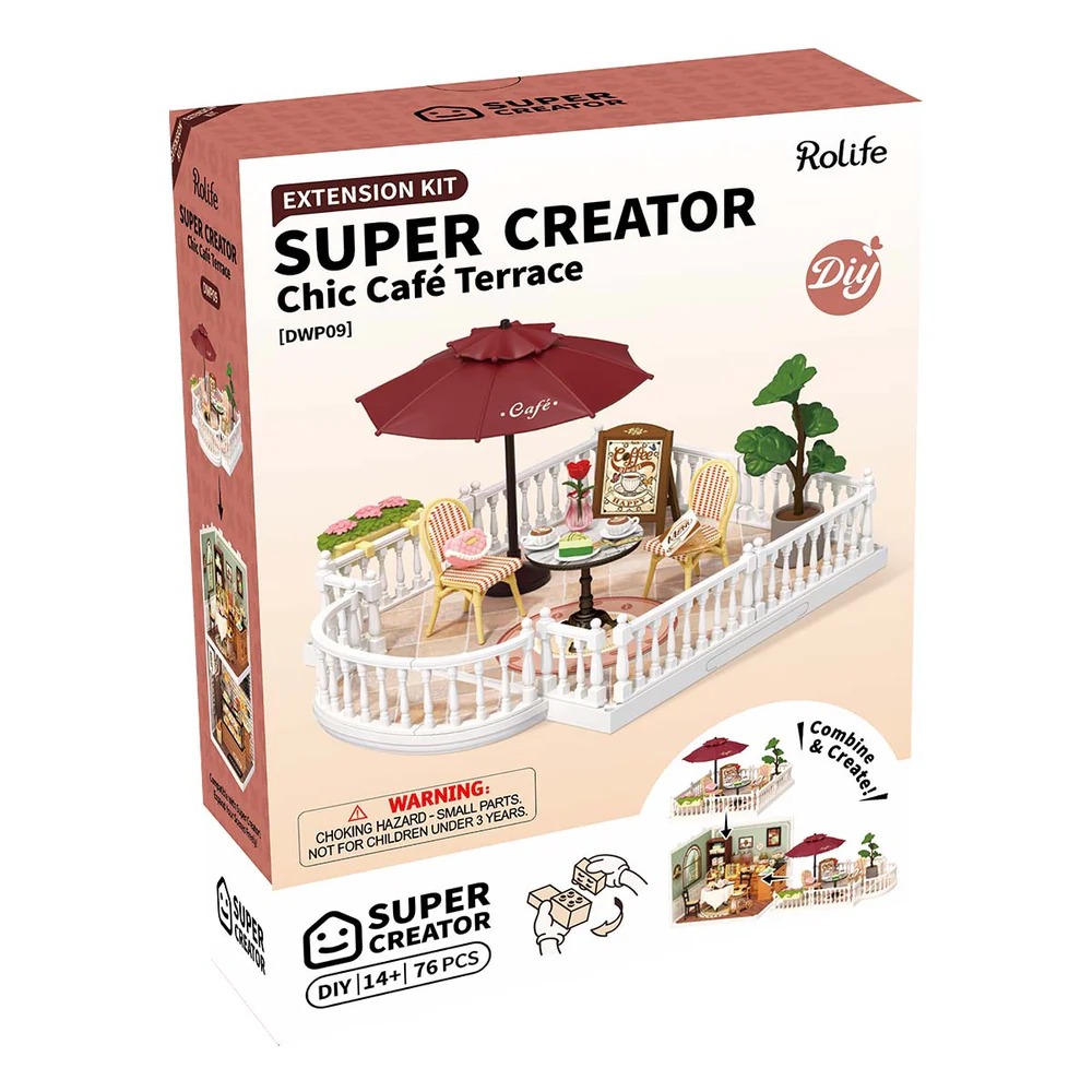 Gói Mở Rộng Terrace được thiết kế để kết nối với các không gian Rolife Super Creator của bạn. Chỉ cần lắp ghép đơn giản là bạn có thể mở rộng thành một ban công ấm cúng hoặc một góc quán cà phê xinh xắn. Dù bạn muốn tạo một nơi ngập nắng để thư giãn hay một không gian phong cách để tụ họp, gói mở rộng này giúp bạn xây dựng phong cách sống mà bạn yêu thích trong thế giới tí hon.