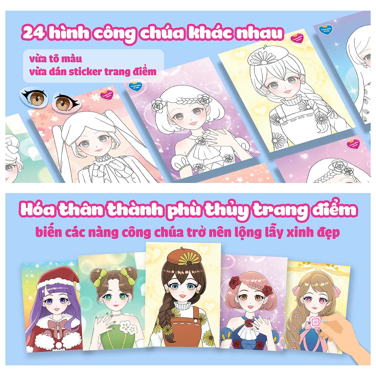 Bộ sách trang điểm công chúa gồm có 5 cuốn, mỗi cuốn có 24 hình công chúa giúp các bé thỏa sức sáng tạo, make up. Các bé có thể trang điểm cho các nàng công chúa với phong cách khác nhau: vẽ lông mày, đeo lens, tô son, đeo khuyên tai, dây chuyền.. làm tất cả mọi thứ để các nàng công chúa xinh hơn.