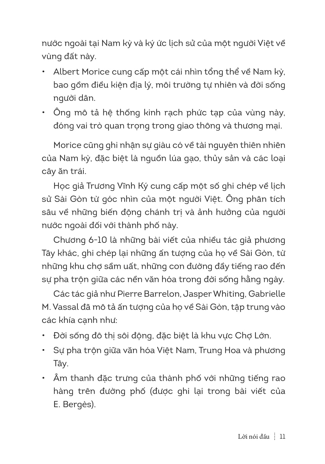 Mở đầu cuốn sách là bút ký của John White, một thương nhân Mỹ đến Sài Gòn năm 1819, cung cấp cái nhìn chi tiết về thành Gia Định thời triều Nguyễn, với những khu chợ nhộn nhịp, hệ thống quan lại, và những nét sinh hoạt thường ngày của cư dân. Tiếp theo, Jules Silvestre ghi lại bối cảnh lịch sử của Sài Gòn trước khi thực dân Pháp đặt chân tới, mô tả sự mở rộng của người Việt vào vùng đất này và vai trò quan trọng của người Hoa trong đời sống kinh tế. Cuộc xâm lược của Pháp vào năm 1859 được thuật lại từ góc nhìn quân sự qua bài viết của A. Benoist de la Grandière, trong khi Albert Morice và Trương Vĩnh Ký mang đến những ghi chép về đời sống, văn hóa và sự thay đổi của thành phố qua các giai đoạn lịch sử. Những tác giả phương Tây như Pierre Barrelon, Jasper Whiting, Gabrielle M. Vassal và Robert Chauvelot thì mang đến những ấn tượng cá nhân về Sài Gòn – từ vẻ đẹp của phố phường, sự giao thoa văn hóa, đến những khu chợ đông đúc và nhịp sống thường nhật. Cuốn sách kết thúc bằng bài viết của E. Bergès mô tả tiếng rao hàng trên đường phố Sài Gòn, mang đến một hình ảnh sinh động về đời sống đô thị xưa.