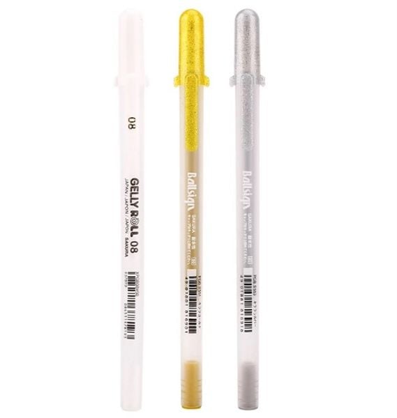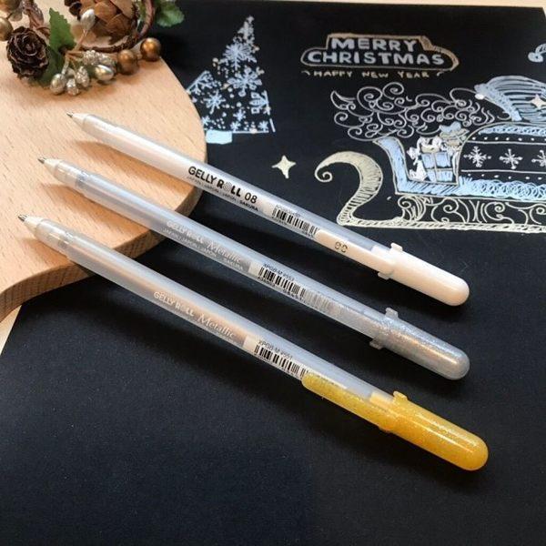 Bộ bút gel Sakura Gelly Roll Metallic & White 3 cây là bộ sản phẩm phổ biến gồm bút mực gel màu vàng ánh kim (gold), bạc ánh kim (silver) và trắng đục (white), rất thích hợp để trang trí, vẽ thiệp và làm nổi bật trên các bề mặt giấy tối màu.