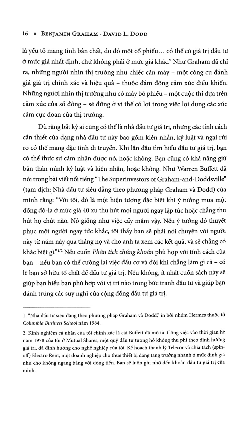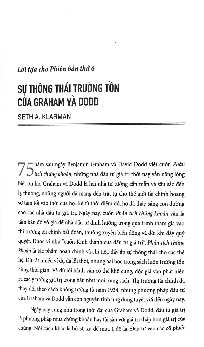 “Các ý tưởng của Graham và Dodd đã vượt qua tất cả các điều kiện thị trường và 75 năm sàng lọc – khiến chúng trở nên xác đáng cho đầu tư hiện đại hơn bao giờ hết. Các bài tiểu luận của Klarman và những nhà đầu tư giá trị huyền thoại khác đã minh họa rõ ràng rằng dù bối cảnh thị trường có thể thay đổi rất nhiều so với những năm trước, nhưng các đặc điểm của nhà đầu tư không thay đổi, và phương pháp ứng dụng có kỷ luật các nguyên tắc của cuốn Phân tích chứng khoán tiếp tục mang lại một lợi thế quan trọng trong đầu tư.”