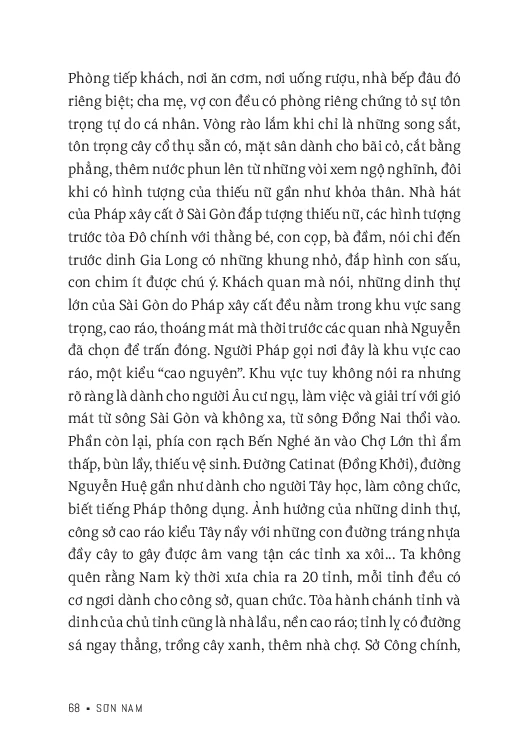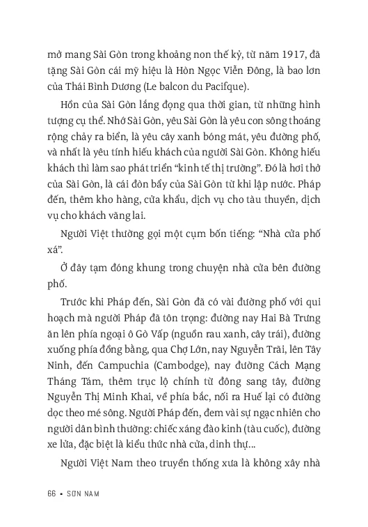 “Nam bộ nói chung, Sài Gòn nói riêng nào phải là ‘địa đàng’-- Xưa kia, người Khmer bản địa sống co cụm trên những giồng cao ráo, làm ruộng thâm canh, không thích triển khai diện tích vào nơi đầm lầy đầy rắn, cọp và bệnh sốt rét. Người Hoa vẫn giữ tập quán thâm canh, ở đất cao, làm rẫy rau cải, không xông xáo ‘phá sơn lâm, đâm Hà bá’ như dân Việt. Dân ta đã định cư ở nơi đất thấp, nước phèn, đốn củi, phá rừng -- vùng đất Nam bộ, vùng đất Sài Gòn – Gia Định ngày nay, công ơn của tổ tiên thật là to lớn.” Đó là một trong những đoạn văn khái quát về Sài Gòn - Gia Định và Nam bộ nói chung qua con mắt Sơn Nam. Không chỉ vậy, còn có những nhân vật cụ thể góp phần làm nên bản sắc vùng đất này, hay là những khu phố, con đường, hàng cây làm nên dấu ấn cho một địa danh.