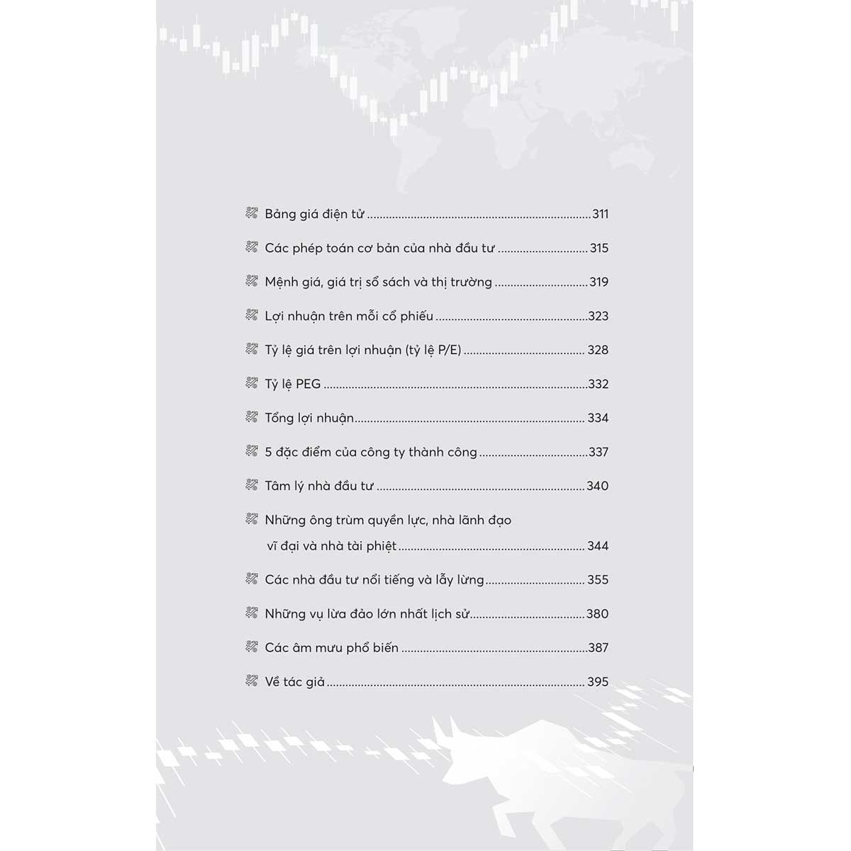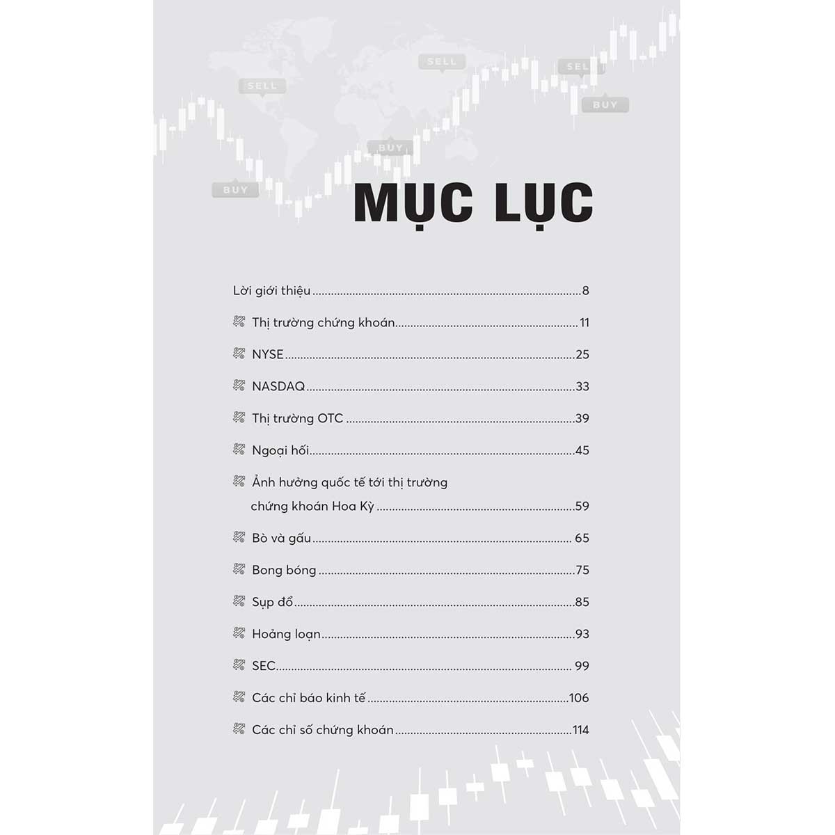 Cuốn sách xây dựng một hệ thống kiến thức nền tảng, bắt đầu từ bản chất của thị trường, phân loại cổ phiếu, cơ chế vận hành của các sàn giao dịch như NYSE, NASDAQ, đến các chỉ số kinh tế, quỹ đầu tư, IPO, và cả những tình huống như bong bóng tài chính, hoảng loạn thị trường.