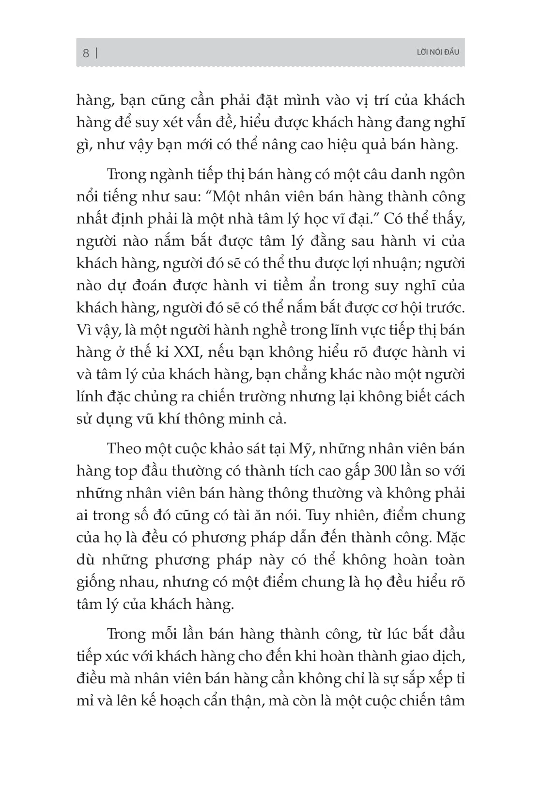 Bán hàng có liên quan đến yếu tố con người và điều quan trọng nhất không thể xem nhẹ đó chính là tâm lý con người. Vì vậy, trong bối cảnh thị trường bán hàng cạnh tranh ngày càng khốc liệt, người nào nắm bắt được tâm lý đằng sau hành vi của khách hàng, người đó sẽ có thể thu được lợi nhuận; người nào dự đoán được hành vi tiềm ẩn trong suy nghĩ của khách hàng, người đó sẽ có thể nắm bắt được cơ hội trước.
