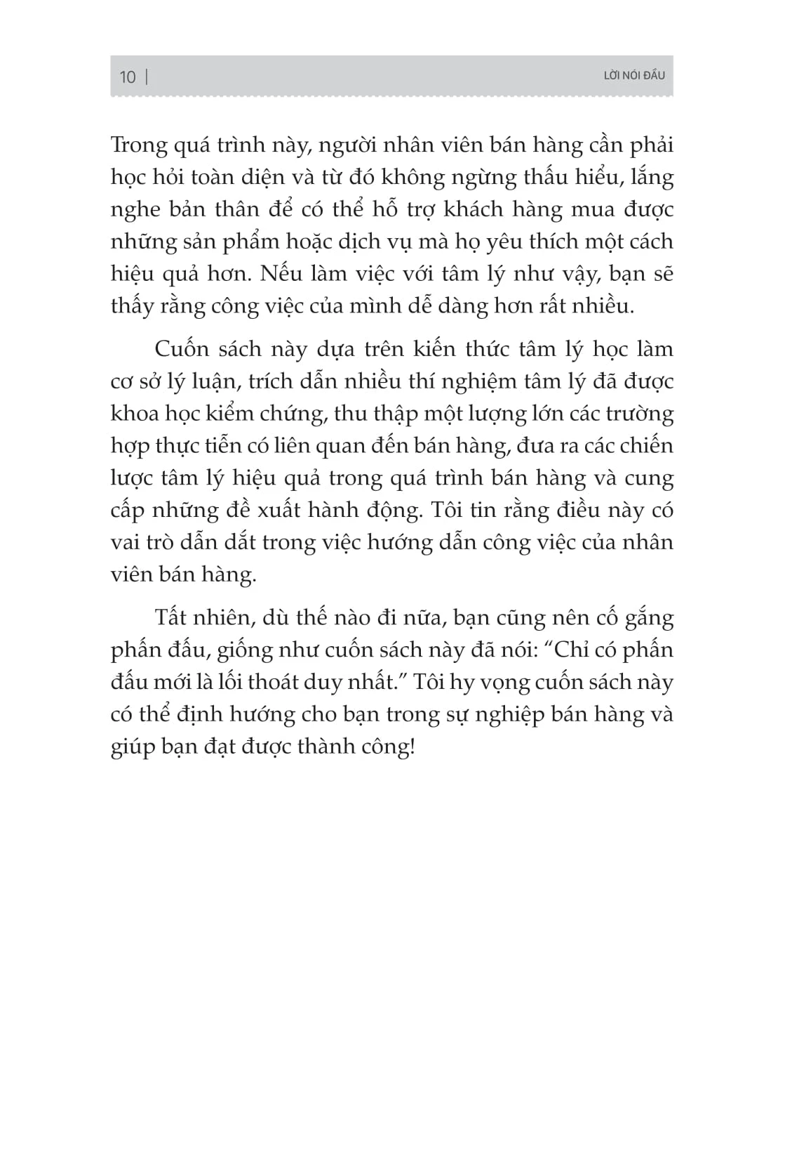 Trong quá trình này, người nhân viên bán hàng cần phải học hỏi toàn diện và từ đó không ngừng thấu hiểu, lắng nghe bản thân để có thể hỗ trợ khách hàng mua được những sản phẩm hoặc dịch vụ mà họ yêu thích một cách hiệu quả hơn. Cuốn sách “Thao túng tâm lý khách hàng bằng tâm lý học” này dựa trên kiến thức tâm lý học, đi kèm với rất nhiều thí nghiệm thực tế, sẽ giúp bạn có được định hướng trong sự nghiệp bán hàng.