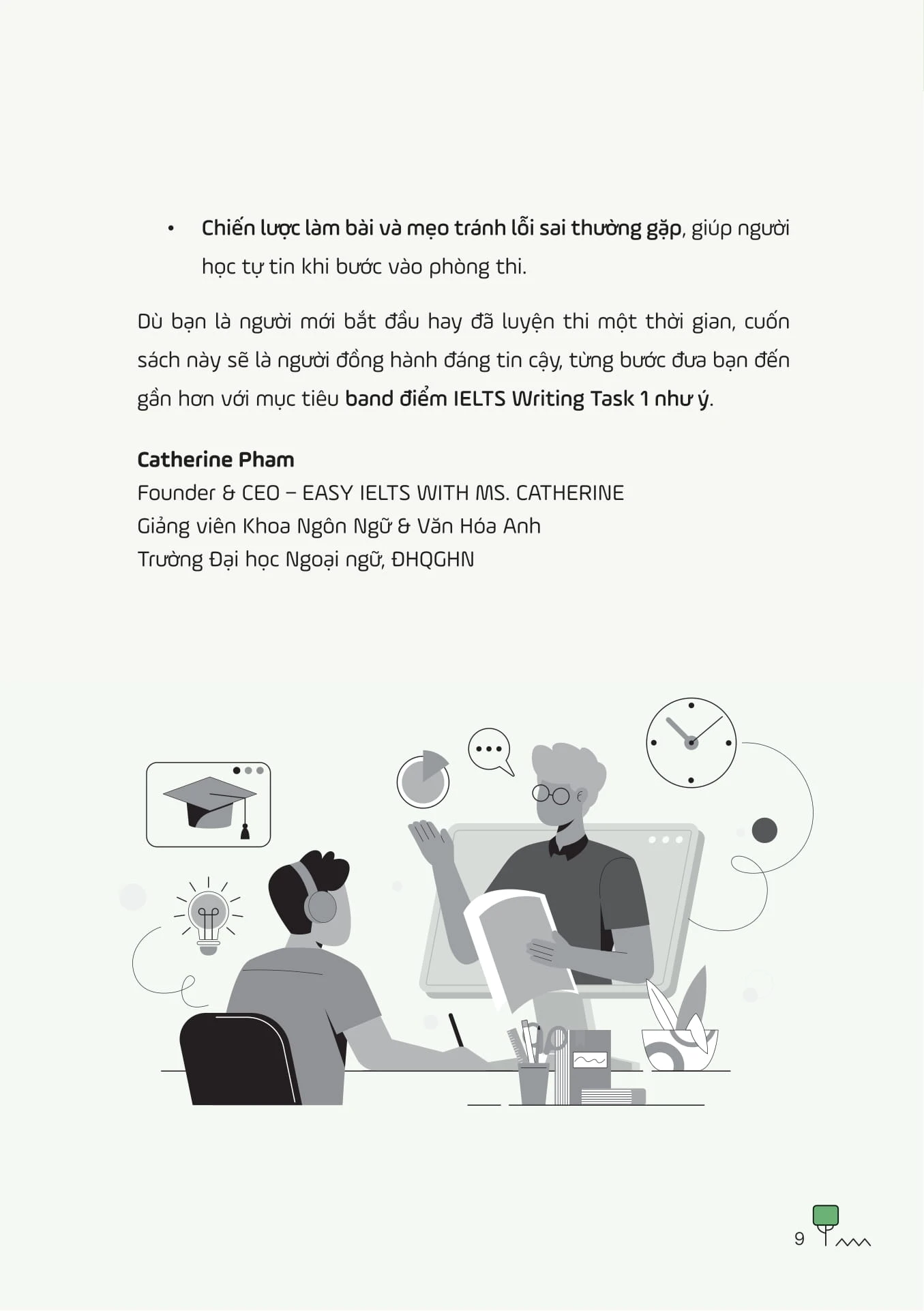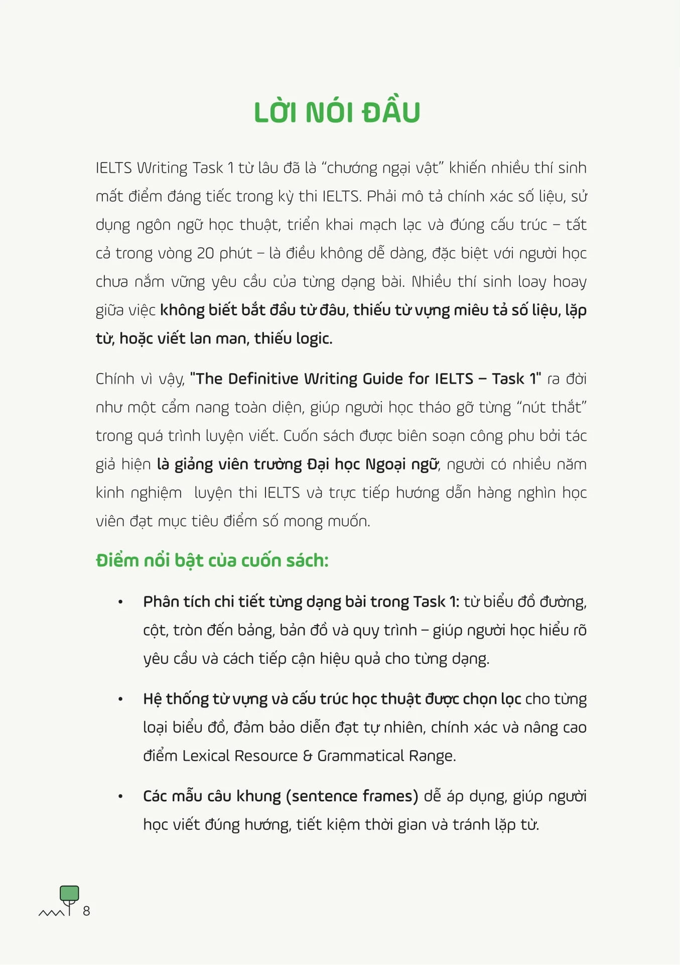 Trên đây là những nội dung nổi bật của cuốn sách mà chúng tôi muốn gửi đến quý bạn đọc – những ai đang trên hành trình chinh phục IELTS Writing một cách bài bản và hiệu quả. Hy vọng cuốn sách sẽ trở thành người bạn đồng hành tin cậy, giúp bạn tự tin vượt qua Task 1 và tiến gần hơn đến mục tiêu điểm số mong muốn.