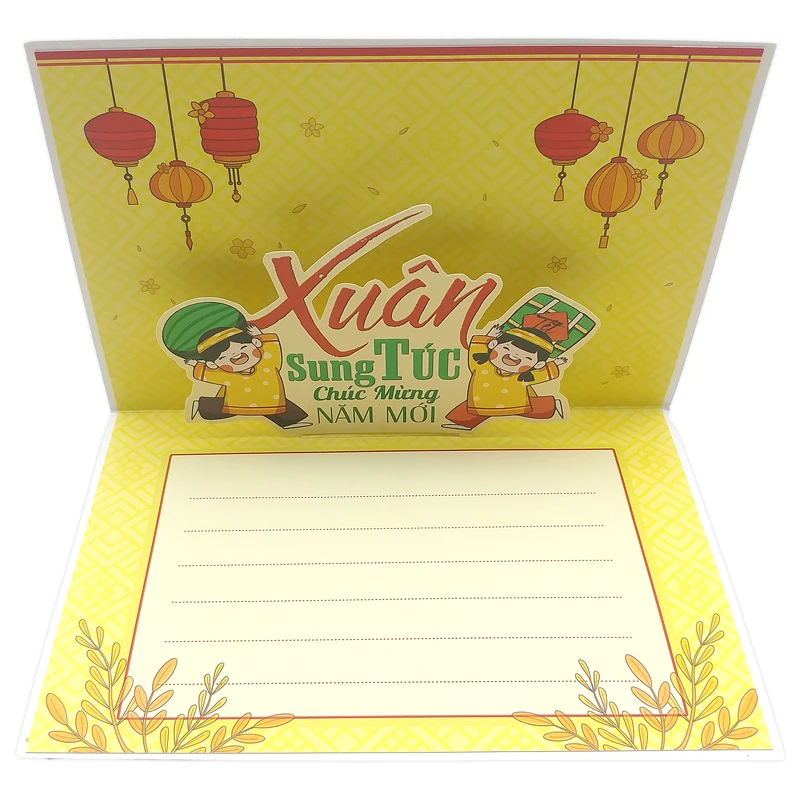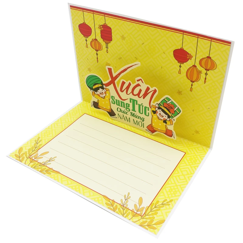 Thiệp Tết sử dụng chất liệu giấy mỹ thuật cao cấp, cứng cáp và trơn láng, khả năng thấm hút mực nhanh và không bị lem mực khi viết.