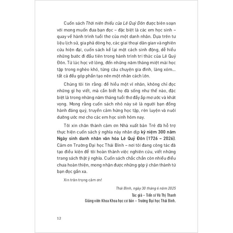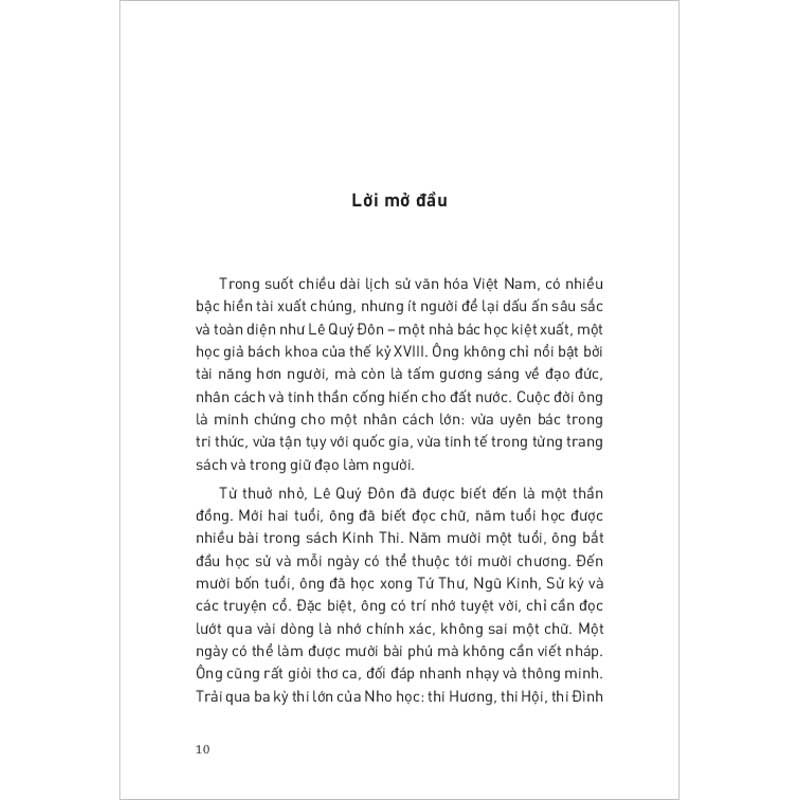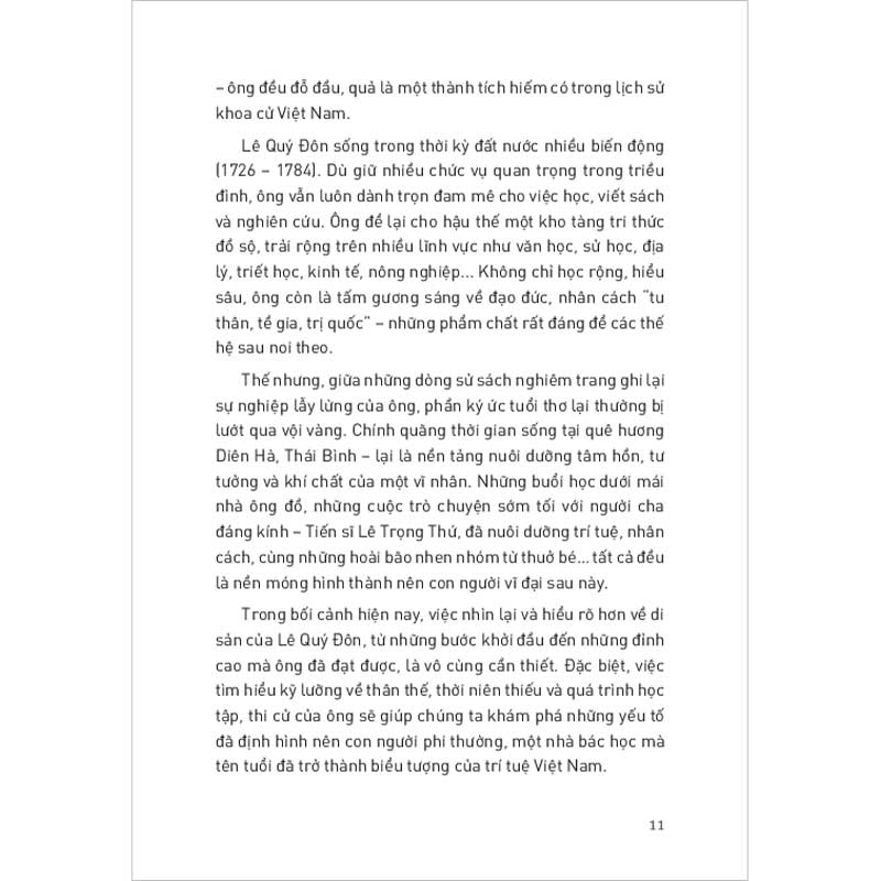 Cuốn sách “Thời niên thiếu của Lê Quý Đôn” được biên soạn với mong muốn đưa bạn đọc – đặc biệt là các em học sinh – quay về hành trình tuổi thơ của một danh nhân. Dựa trên tư liệu lịch sử, gia phả dòng họ, các giai thoại dân gian và nghiên cứu hiện đại, cuốn sách kể lại một cách sinh động, dễ hiểu những bước đi đầu tiên trong hành trình tri thức của Lê Quý Đôn. Từ lúc học vỡ lòng, đến những năm tháng miệt mài học tập trong nghèo khó, từng câu chuyện gia đình, làng xóm… tất cả đều góp phần tạo nên một nhân cách lớn.